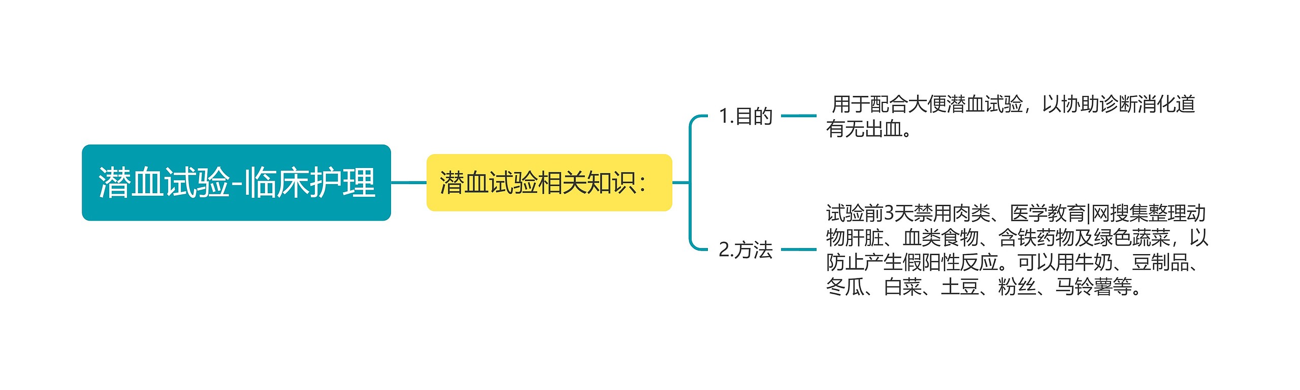 潜血试验相关知识: 1.目的 用于配合大便潜血试验,以协助诊断消化道有无出血。 2.方法 试验前3天禁用肉类、医学教育|网搜集整理动物肝脏、血类食物、含铁药物及绿色蔬菜,以防止产生假阳性反应。可以用牛奶、豆制品、冬瓜、白菜、土豆、粉丝、马铃薯等。