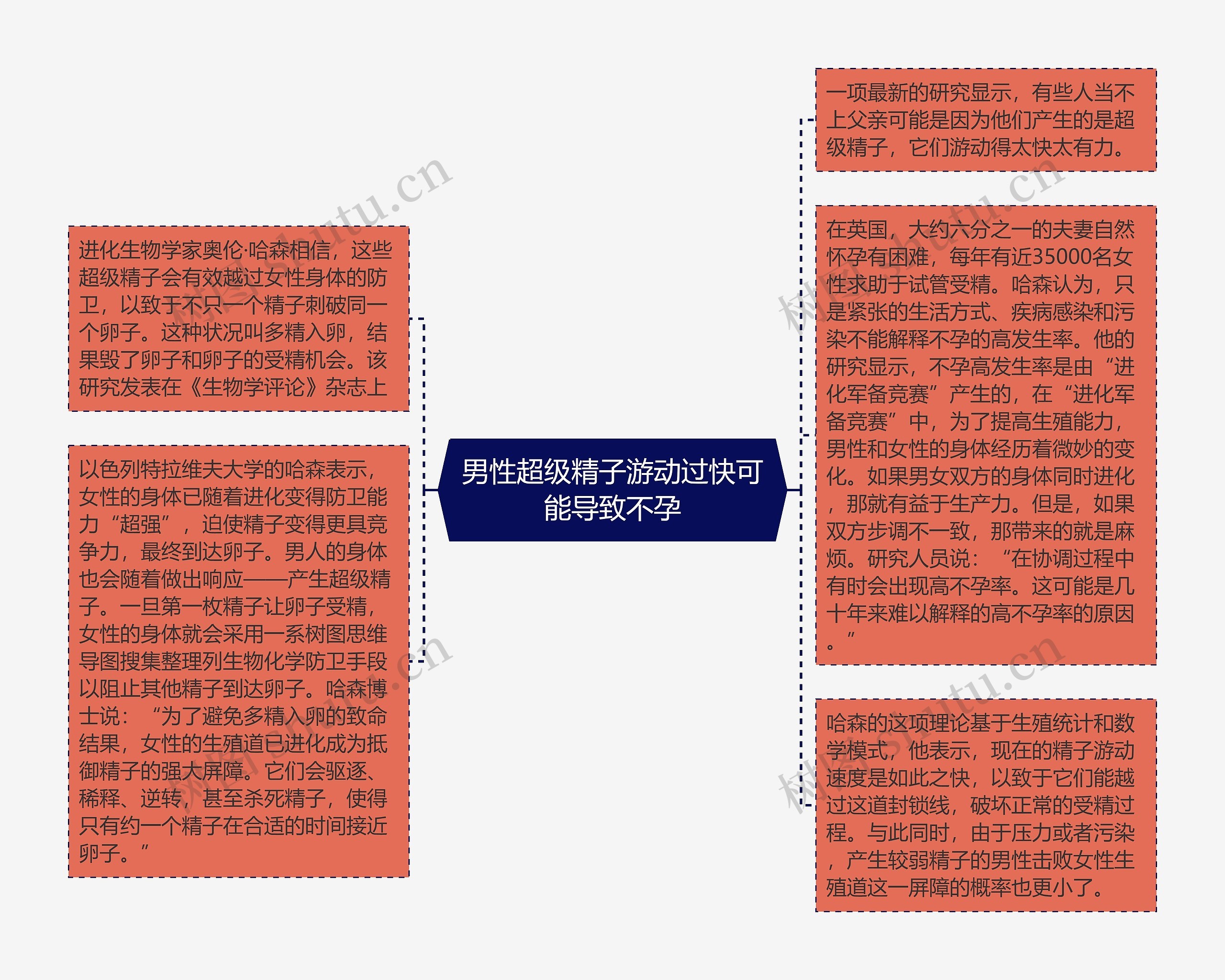 以色列特拉维夫大学的哈森表示,女性的身体已随着进化变得防卫能力“超强”,迫使精子变得更具竞争力,最终到达卵子。男人的身体也会随着做出响应——产生超级精子。一旦第一枚精子让卵子受精,女性的身体就会采用一系树图思维导图搜集整理列生物化学防卫手段以阻止其他精子到达卵子。哈森博士说:“为了避免多精入卵的致命结果,女性的生殖道已进化成为抵御精子的强大屏障。它们会驱逐、稀释、逆转,甚至杀死精子,使得只有约一个精子在合适的时间接近卵子。”