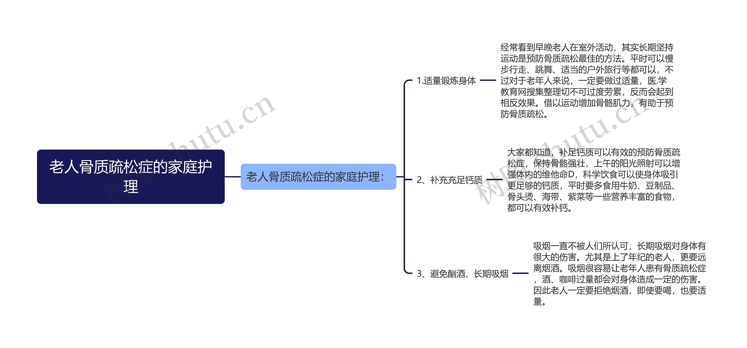 树图思维导图提供《老人骨质疏松症的家庭护理》在线思维导图免费制作,点击“编辑”按钮,可对《老人骨质疏松症的家庭护理》进行在线思维导图编辑,本思维导图属于思维导图模板主题,文件编号是:74c49dd817a85663247b7f01b7b7bbec