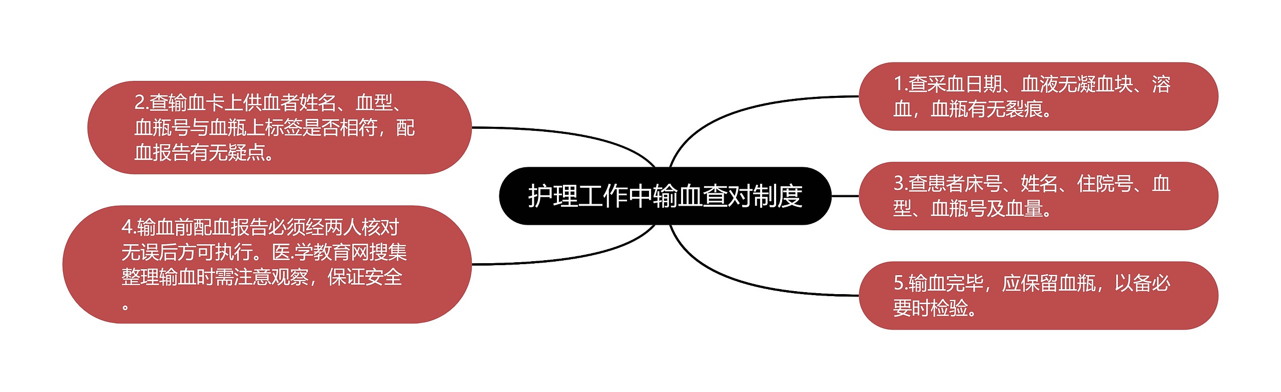 1.查采血日期、血液无凝血块、溶血,血瓶有无裂痕。 2.查输血卡上供血者姓名、血型、血瓶号与血瓶上标签是否相符,配血报告有无疑点。 3.查患者床号、姓名、住院号、血型、血瓶号及血量。 4.输血前配血报告必须经两人核对无误后方可执行。医.学教育网搜集整理输血时需注意观察,保证安全。