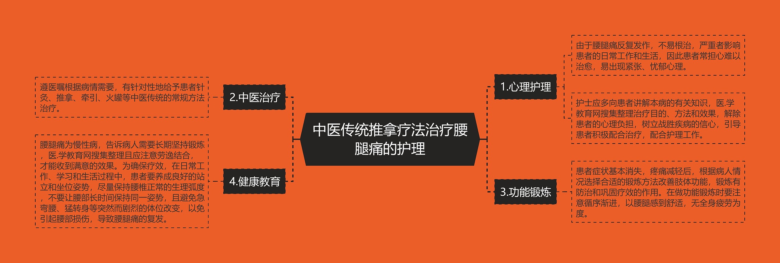 树图思维导图提供《中医传统推拿疗法治疗腰腿痛的护理》在线思维导图免费制作,点击“编辑”按钮,可对《中医传统推拿疗法治疗腰腿痛的护理》进行在线思维导图编辑,本思维导图属于思维导图模板主题,文件编号是:4620bca2c8a74e2c24828740e200ff07