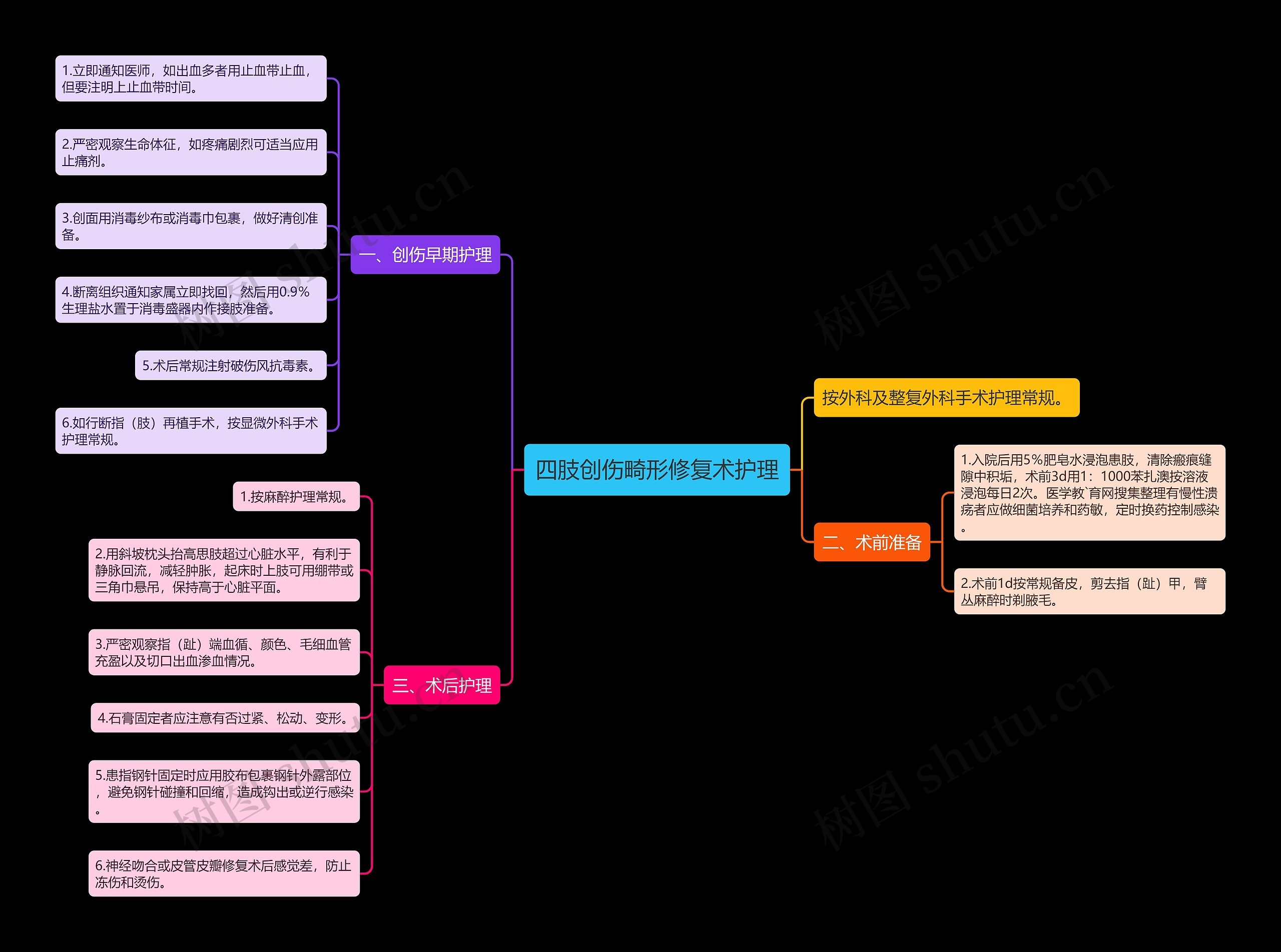树图思维导图提供《四肢创伤畸形修复术护理》在线思维导图免费制作,点击“编辑”按钮,可对《四肢创伤畸形修复术护理》进行在线思维导图编辑,本思维导图属于思维导图模板主题,文件编号是:574dbcc845ede269e53f042314442517
