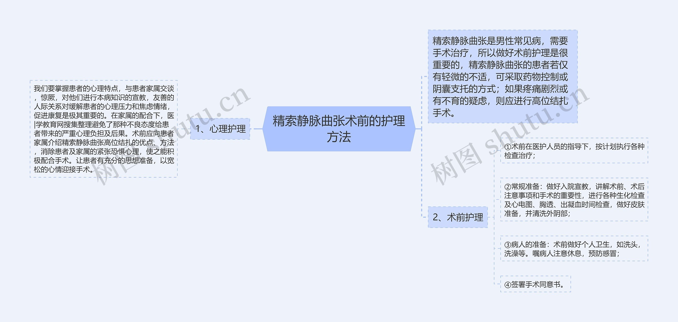树图思维导图提供《精索静脉曲张术前的护理方法》在线思维导图免费制作,点击“编辑”按钮,可对《精索静脉曲张术前的护理方法》进行在线思维导图编辑,本思维导图属于思维导图模板主题,文件编号是:d0afcce2ad186fe5fedf0b9ecf79cd28