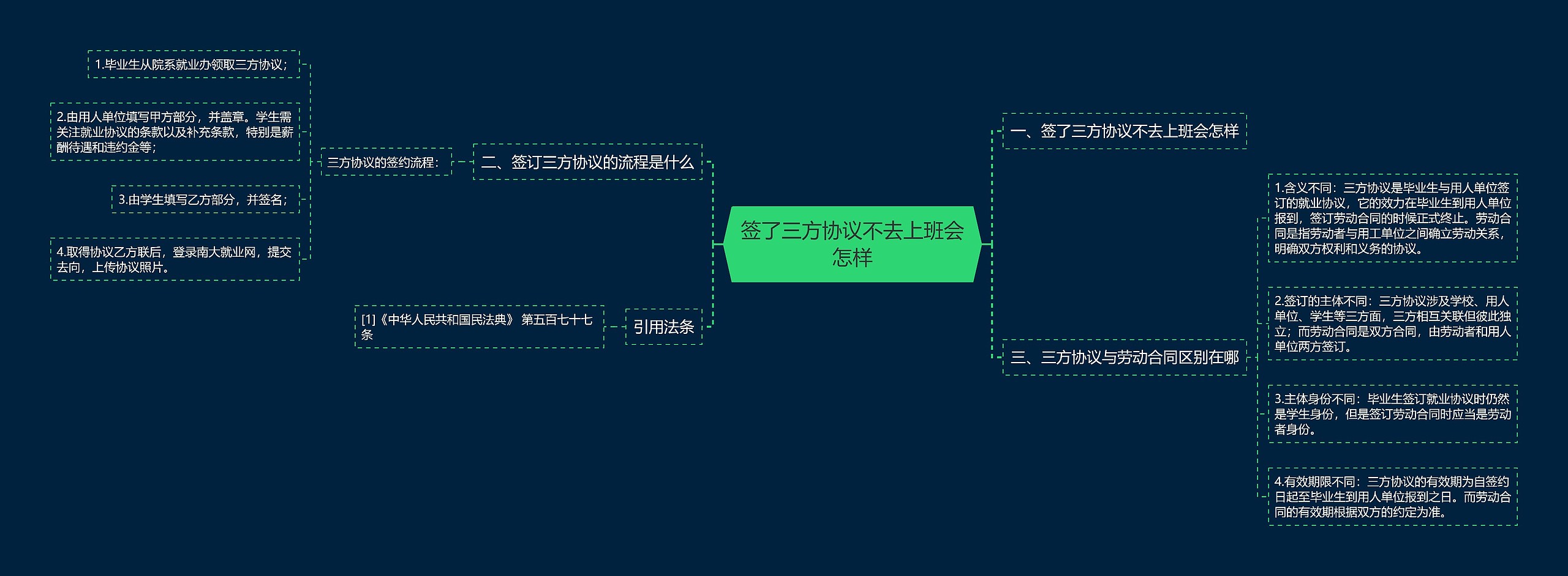 树图思维导图提供《签了三方协议不去上班会怎样》在线思维导图免费制作,点击“编辑”按钮,可对《签了三方协议不去上班会怎样》进行在线思维导图编辑,本思维导图属于思维导图模板主题,文件编号是:9763c209b138b265f4e8958f3e23f81d