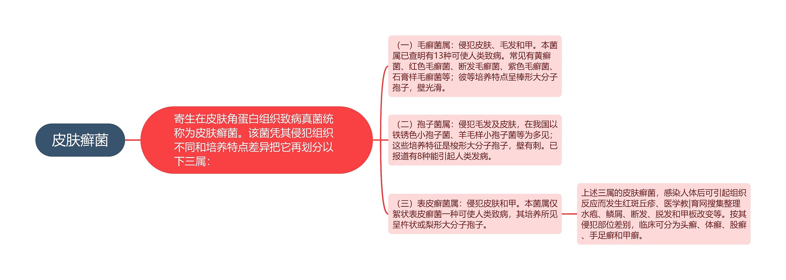 寄生在皮肤角蛋白组织致病真菌统称为皮肤癣菌。该菌凭其侵犯组织不同和培养特点差异把它再划分以下三属: (一)毛癣菌属:侵犯皮肤、毛发和甲。本菌属已查明有13种可使人类致病。常见有黄癣菌、红色毛癣菌、断发毛癣菌、紫色毛癣菌、石膏样毛癣菌等;彼等培养特点呈棒形大分子孢子,壁光滑。