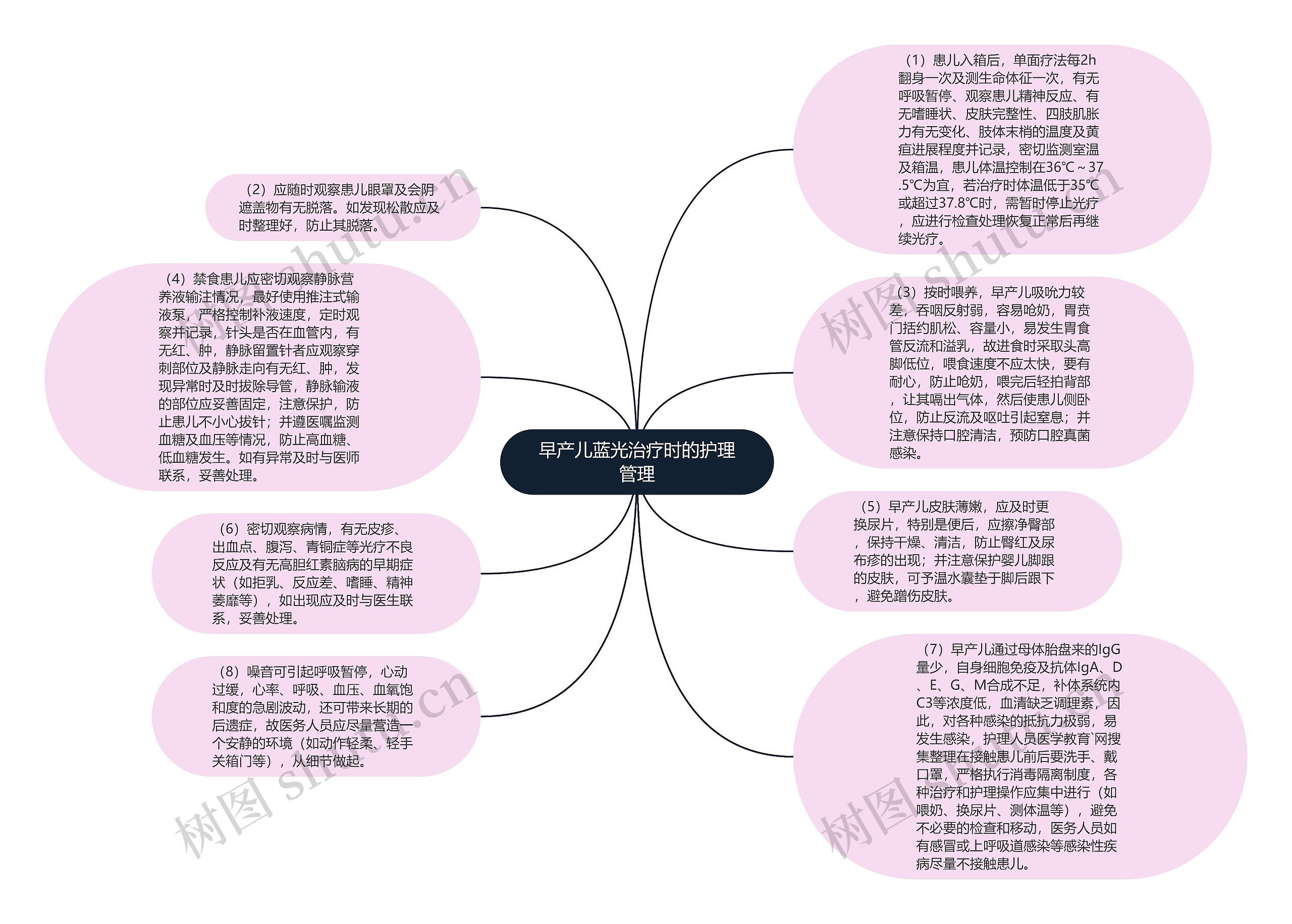 (6)密切观察病情,有无皮疹、出血点、腹泻、青铜症等光疗不良反应及有无高胆红素脑病的早期症状(如拒乳、反应差、嗜睡、精神萎靡等),如出现应及时与医生联系,妥善处理。