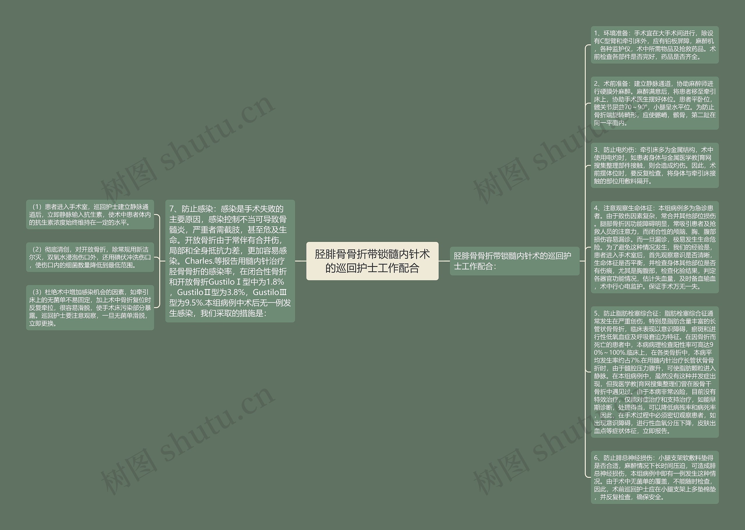 5、防止脂肪栓塞综合征:脂肪栓塞综合征通常发生在严重创伤,特别是脂肪含量丰富的长管状骨骨折,临床表现以意识障碍,瘀斑和进行性低氧血症及呼吸窘迫为特征。在因骨折而死亡的患者中,本病病理检查阳性率可高达90%~100%.临床上,在各类骨折中,本病平均发生率约占7%.在用髓内针治疗长管状骨骨折时,由于髓腔压力骤升,可使脂肪颗粒进入静脉。在本组病例中,虽然没有这种并发症出现,但我医学教|育网搜集整理们曾在股骨干骨折中遇见过。由于本病非常凶险,目前没有特效治疗,仅能对症治疗和支持治疗,如能早期诊断,处理得当,可以降低病残率和病死率,因此,在手术过程中必须密切观察患者,如出现意识障碍,进行性血氧分压下降,皮肤出血点等症状体征,立即报告。