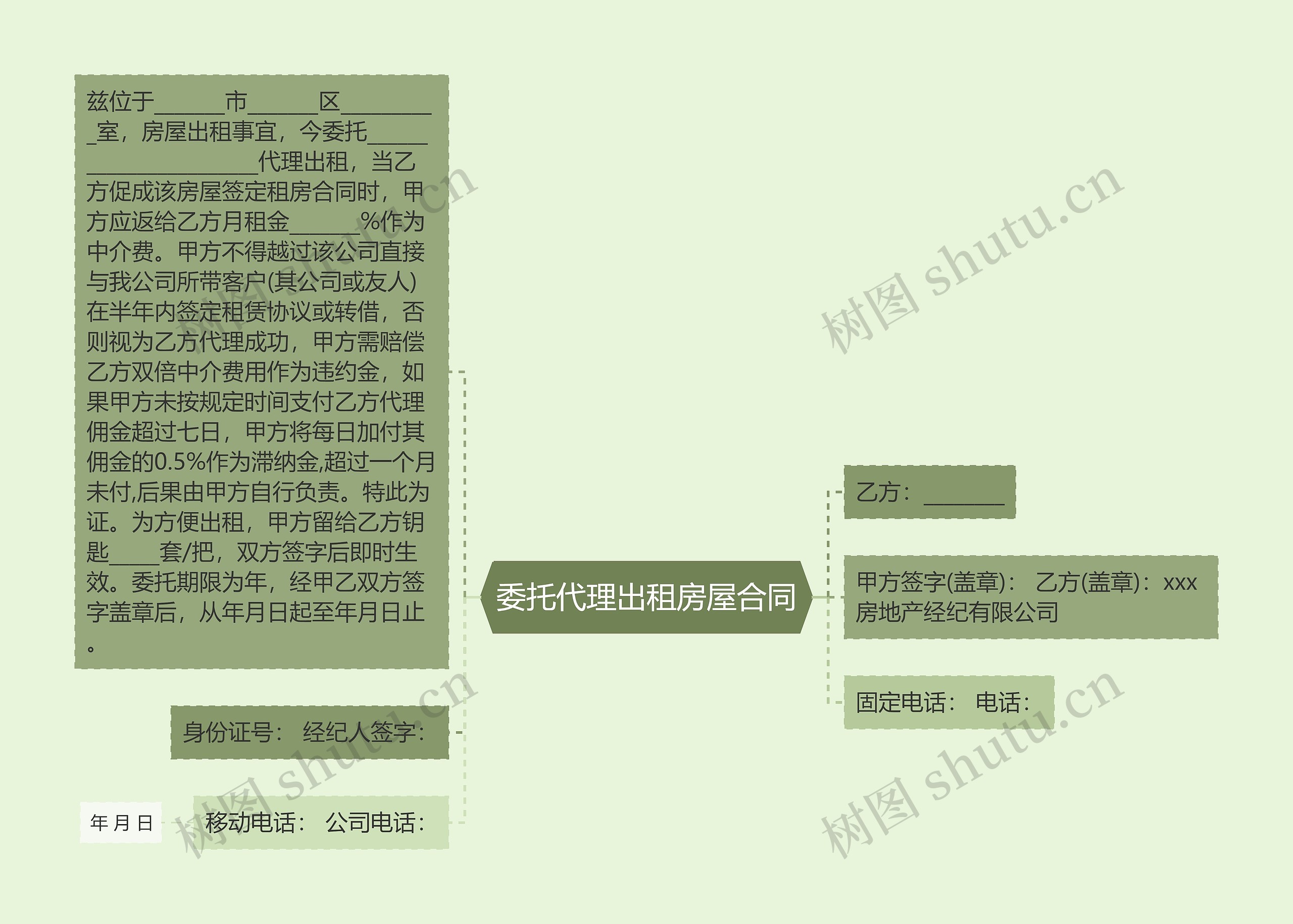 兹位于_______市_______区__________室,房屋出租事宜,今委托_______________________代理出租,当乙方促成该房屋签定租房合同时,甲方应返给乙方月租金_______%作为中介费。甲方不得越过该公司直接与我公司所带客户(其公司或友人)在半年内签定租赁协议或转借,否则视为乙方代理成功,甲方需赔偿乙方双倍中介费用作为违约金,如果甲方未按规定时间支付乙方代理佣金超过七日,甲方将每日加付其佣金的0.5%作为滞纳金,超过一个月未付,后果由甲方自行负责。特此为证。为方便出租,甲方留给乙方钥匙_____套/把,双方签字后即时生效。委托期限为年,经甲乙双方签字盖章后,从年月日起至年月日止。