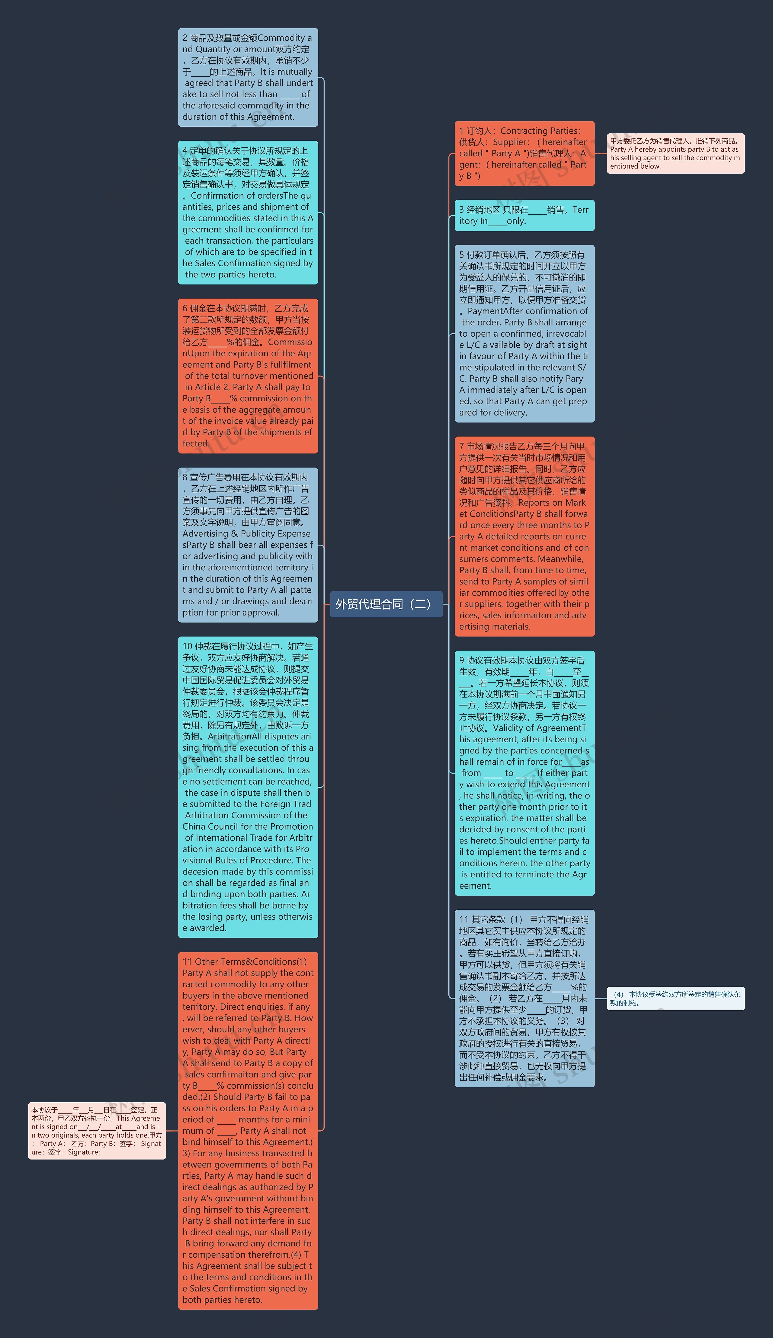 11 其它条款(1) 甲方不得向经销地区其它买主供应本协议所规定的商品,如有询价,当转给乙方洽办。若有买主希望从甲方直接订购,甲方可以供货,但甲方须将有关销售确认书副本寄给乙方,并按所达成交易的发票金额给乙方_____%的佣金。(2) 若乙方在_____月内未能向甲方提供至少_____的订货,甲方不承担本协议的义务。(3) 对双方政府间的贸易,甲方有权按其政府的授权进行有关的直接贸易,而不受本协议的约束。乙方不得干涉此种直接贸易,也无权向甲方提出任何补偿或佣金要求。
