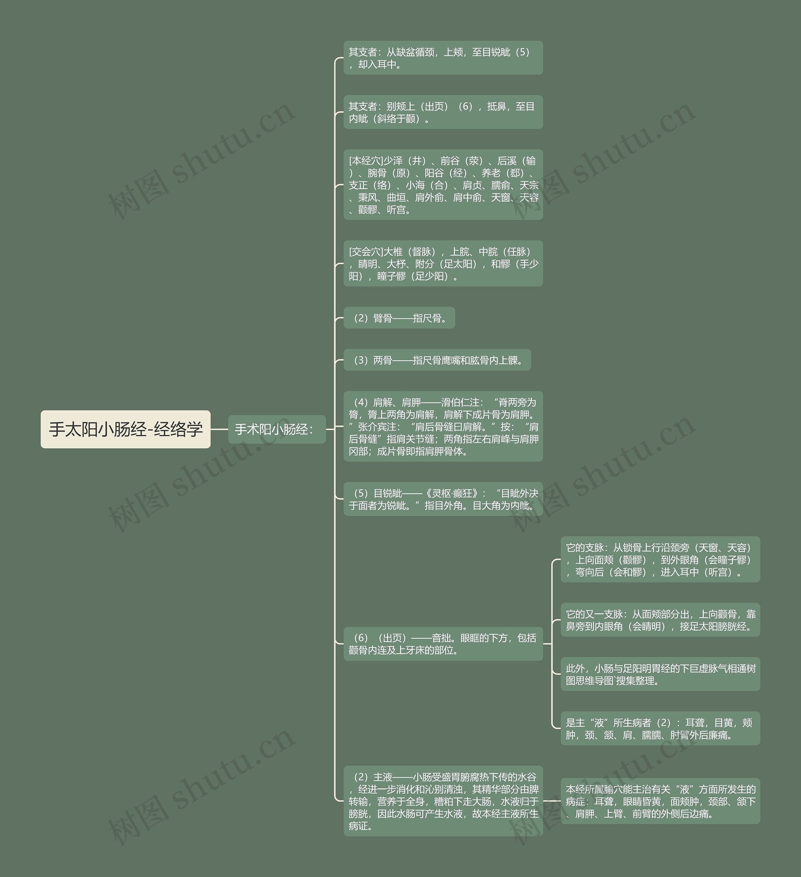 它的支脉:从锁骨上行沿颈旁(天窗、天容),上向面颊(颧髎),到外眼角(会瞳子髎),弯向后(会和髎),进入耳中(听宫)。