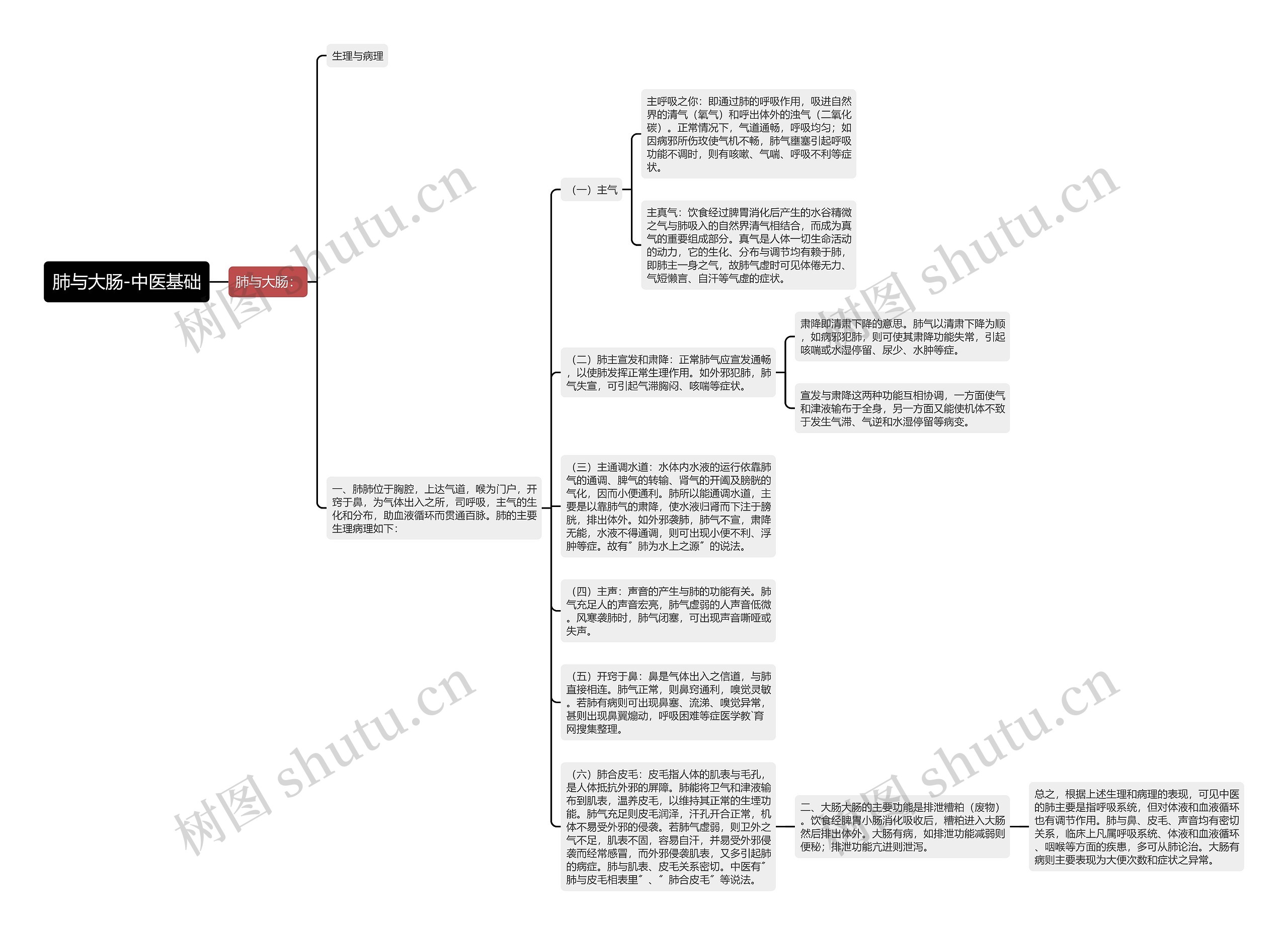 总之,根据上述生理和病理的表现,可见中医的肺主要是指呼吸系统,但对体液和血液循环也有调节作用。肺与鼻、皮毛、声音均有密切关系,临床上凡属呼吸系统、体液和血液循环、咽喉等方面的疾患,多可从肺论治。大肠有病则主要表现为大便次数和症状之异常。