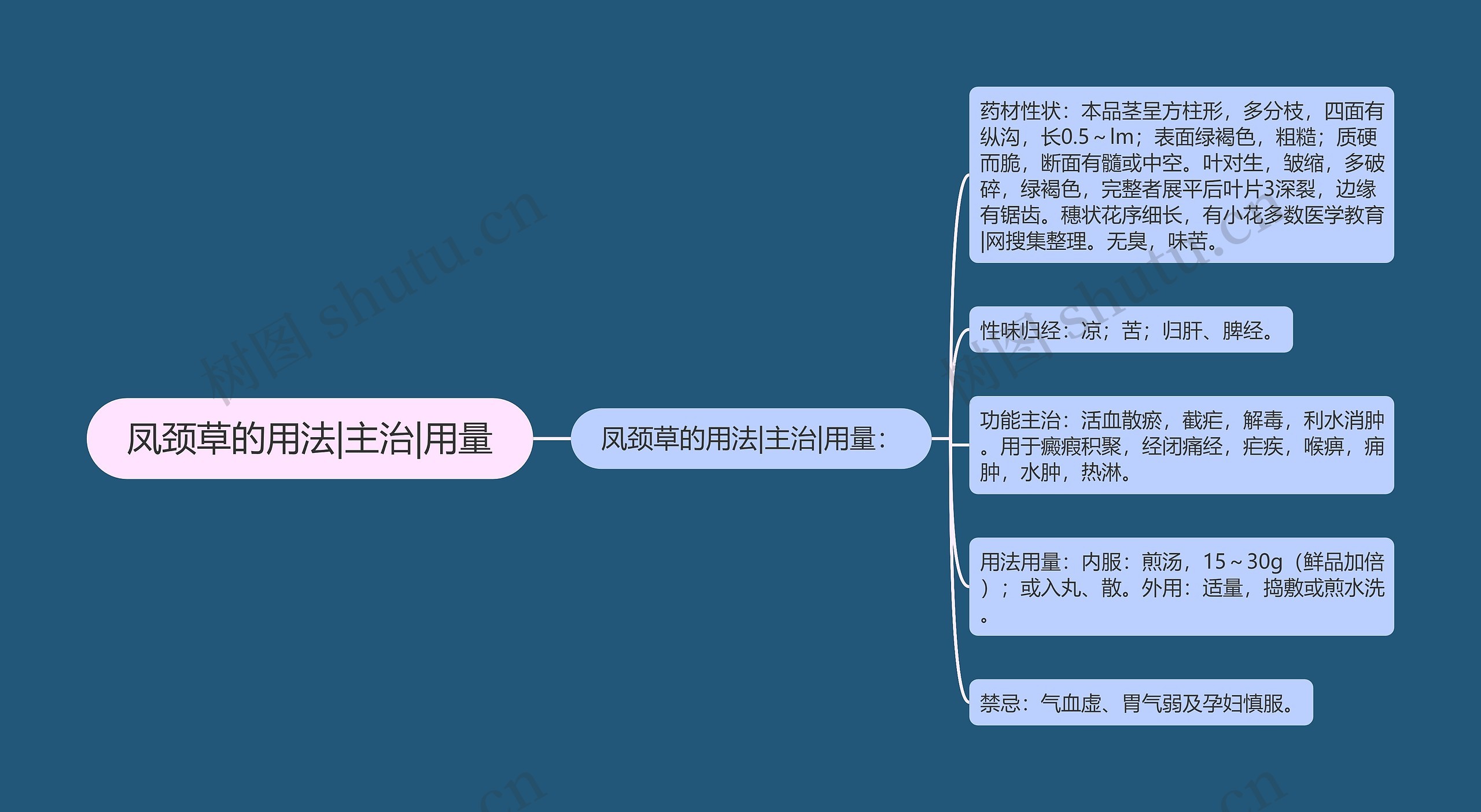 树图思维导图提供《凤颈草的用法|主治|用量》在线思维导图免费制作,点击“编辑”按钮,可对《凤颈草的用法|主治|用量》进行在线思维导图编辑,本思维导图属于思维导图模板主题,文件编号是:e73a08e6909049a1a7f4718a9081904d