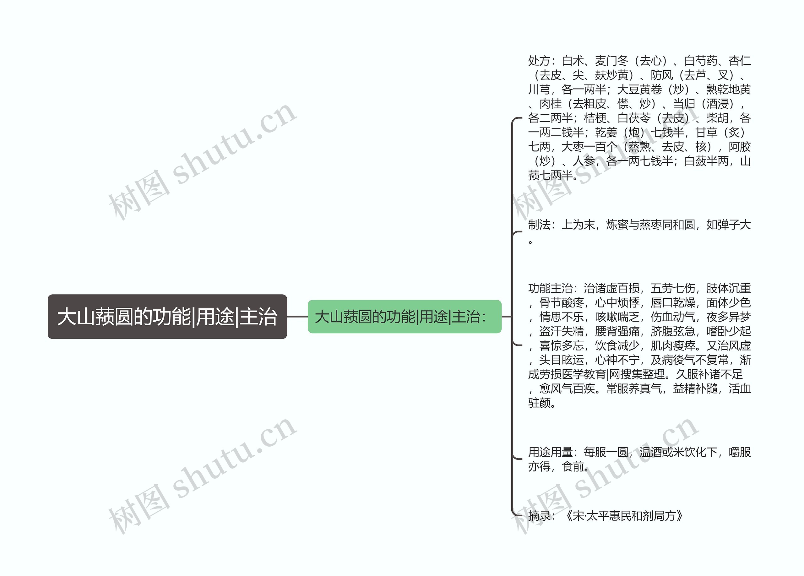 树图思维导图提供《大山蓣圆的功能|用途|主治》在线思维导图免费制作,点击“编辑”按钮,可对《大山蓣圆的功能|用途|主治》进行在线思维导图编辑,本思维导图属于思维导图模板主题,文件编号是:b4c85a80c534c4fe16669e012d807c0e