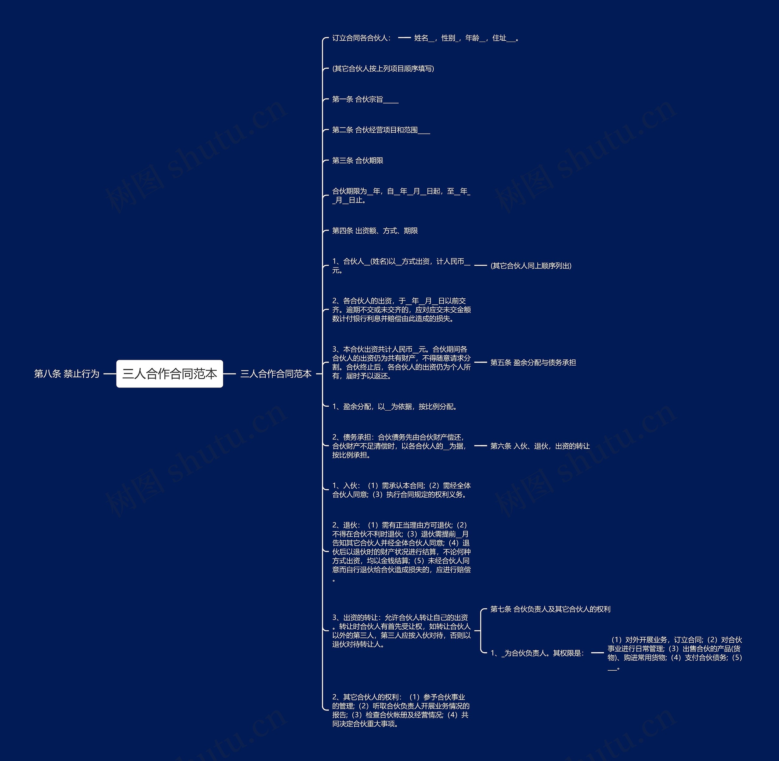 2、退伙:(1)需有正当理由方可退伙;(2)不得在合伙不利时退伙;(3)退伙需提前__月告知其它合伙人并经全体合伙人同意;(4)退伙后以退伙时的财产状况进行结算,不论何种方式出资,均以金钱结算;(5)未经合伙人同意而自行退伙给合伙造成损失的,应进行赔偿。