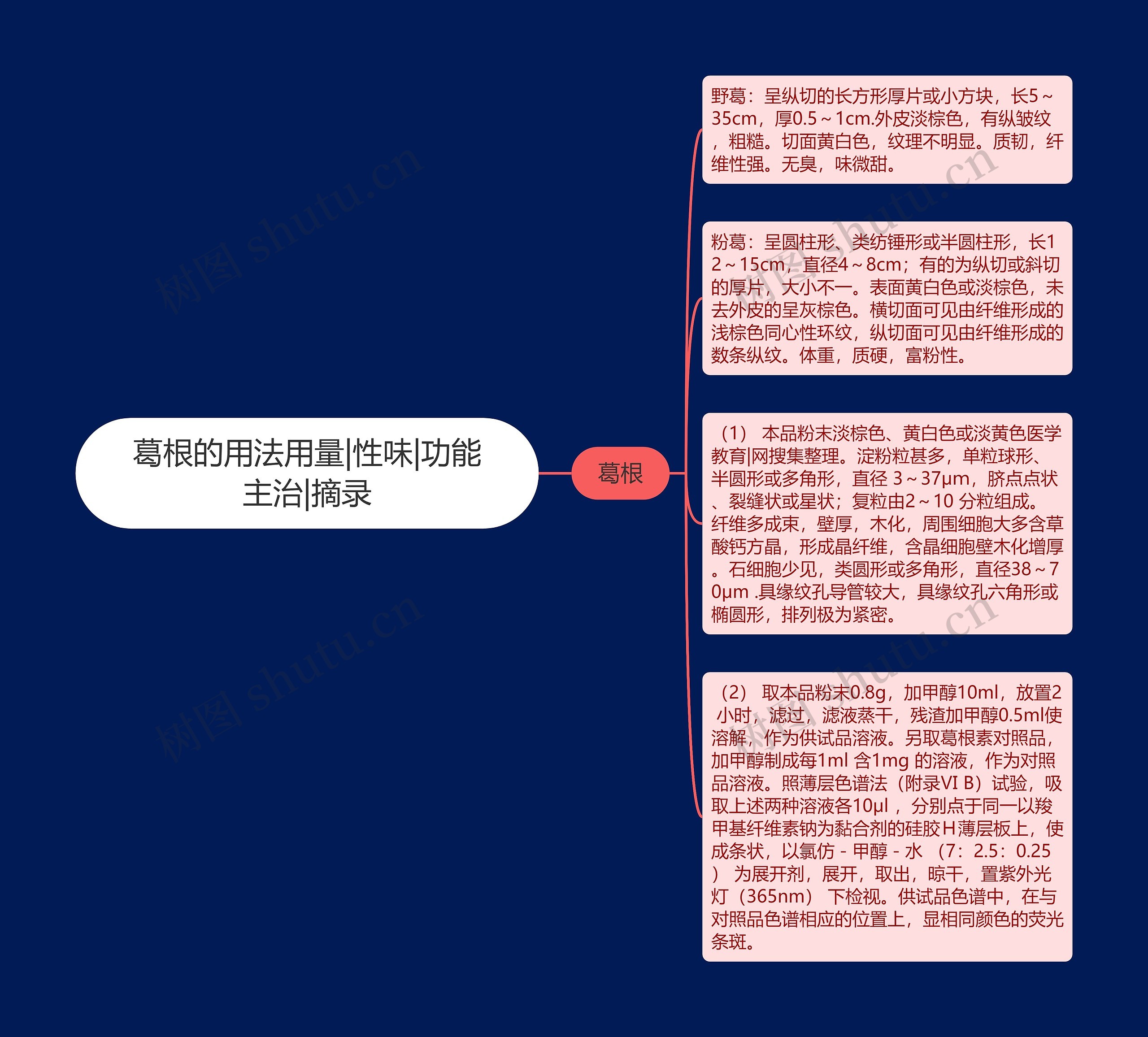 野葛:呈纵切的长方形厚片或小方块,长5~35cm,厚0.5~1cm.外皮淡棕色,有纵皱纹,粗糙。切面黄白色,纹理不明显。质韧,纤维性强。无臭,味微甜。