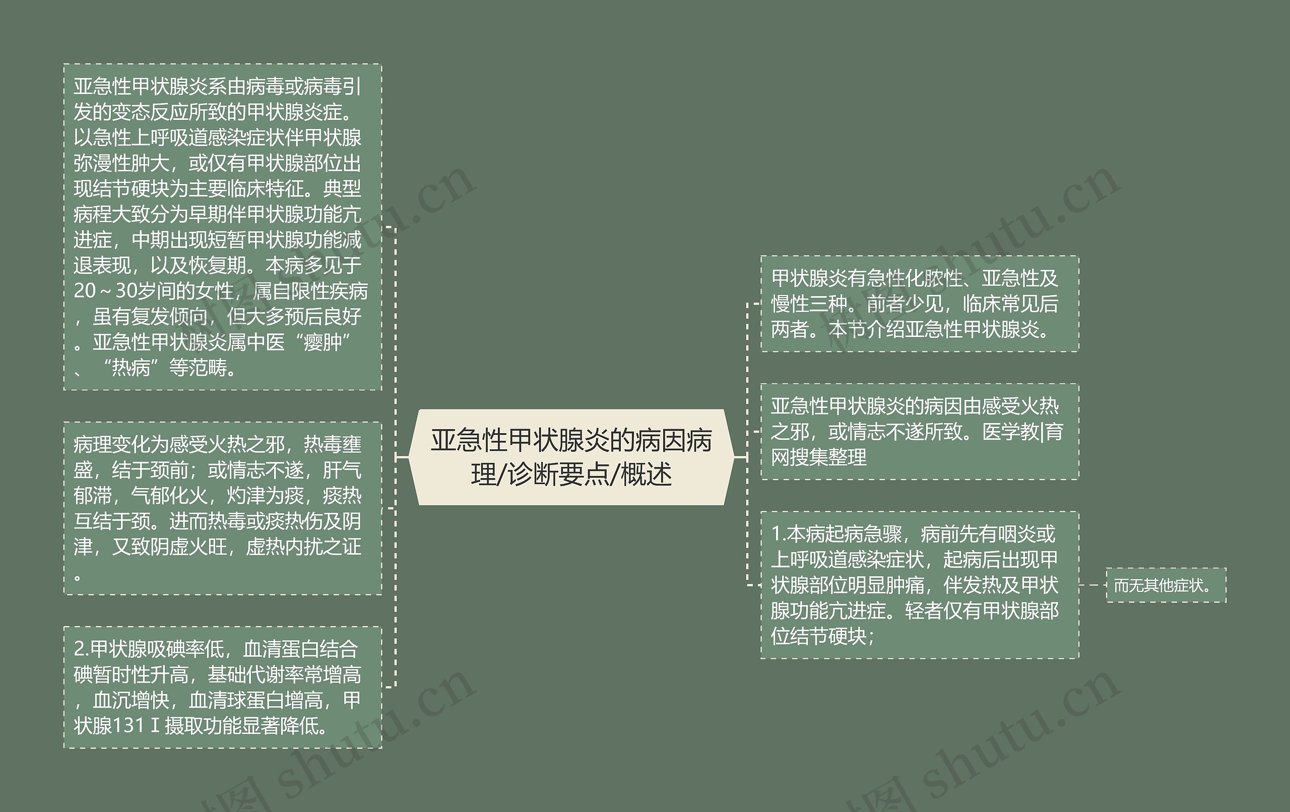 树图思维导图提供《亚急性甲状腺炎的病因病理/诊断要点/概述》在线思维导图免费制作,点击“编辑”按钮,可对《亚急性甲状腺炎的病因病理/诊断要点/概述》进行在线思维导图编辑,本思维导图属于思维导图模板主题,文件编号是:8b214a6b0c6677025a972e7faf68778e