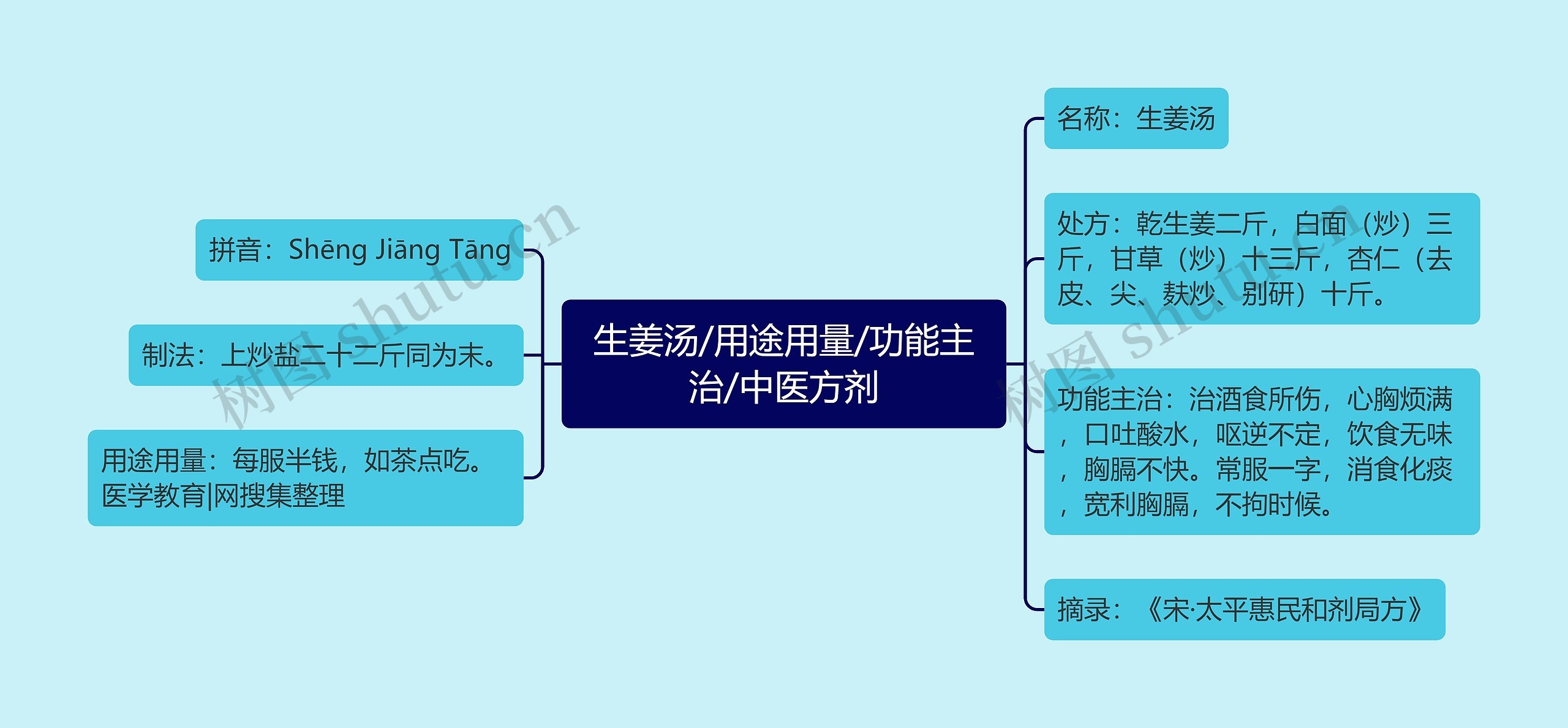 树图思维导图提供《生姜汤/用途用量/功能主治/中医方剂》在线思维导图免费制作,点击“编辑”按钮,可对《生姜汤/用途用量/功能主治/中医方剂》进行在线思维导图编辑,本思维导图属于思维导图模板主题,文件编号是:2d918904445d723230c813f9bfd0d0a8