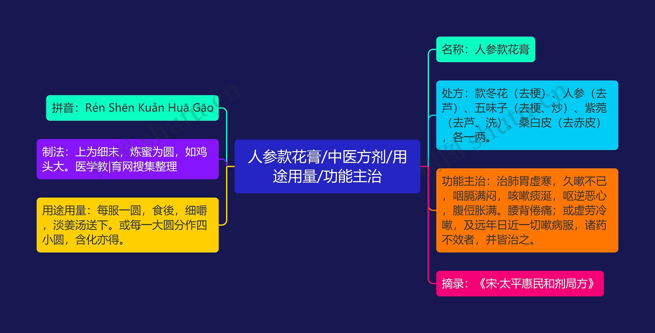 名称:人参款花膏 拼音:Rén Shēn Kuǎn Huā Gāo 处方:款冬花(去梗)、人参(去芦)、五味子(去梗、炒)、紫菀(去芦、洗)、桑白皮(去赤皮),各一两。 制法:上为细末,炼蜜为圆,如鸡头大。医学教|育网搜集整理 功能主治:治肺胃虚寒,久嗽不已,咽膈满闷,咳嗽痰涎,呕逆恶心,腹侸胀满。