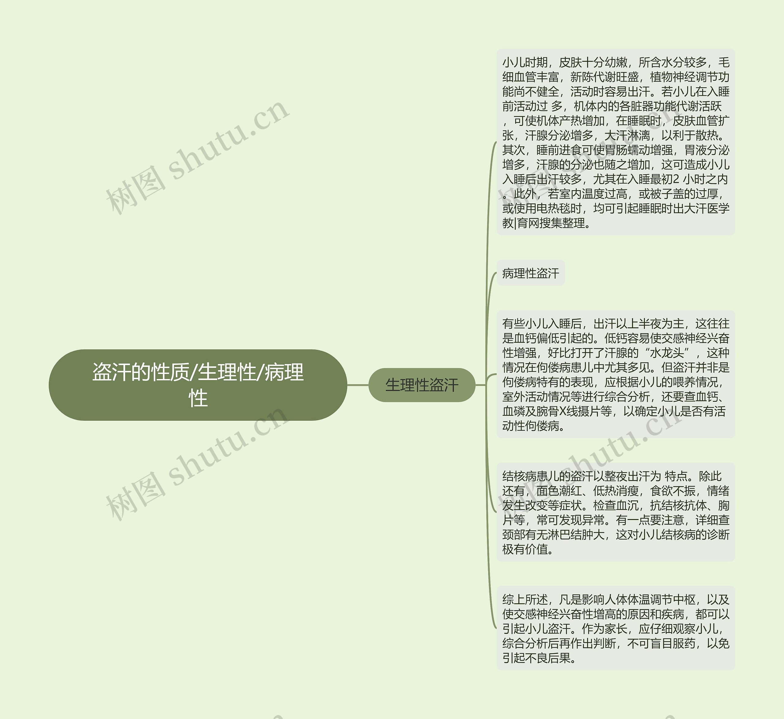 小儿时期,皮肤十分幼嫩,所含水分较多,毛细血管丰富,新陈代谢旺盛,植物神经调节功能尚不健全,活动时容易出汗。若小儿在入睡前活动过 多,机体内的各脏器功能代谢活跃,可使机体产热增加,在睡眠时,皮肤血管扩张,汗腺分泌增多,大汗淋漓,以利于散热。其次,睡前进食可使胃肠蠕动增强,胃液分泌增多,汗腺的分泌也随之增加,这可造成小儿入睡后出汗较多,尤其在入睡最初2 小时之内。此外,若室内温度过高,或被子盖的过厚,或使用电热毯时,均可引起睡眠时出大汗医学教|育网搜集整理。