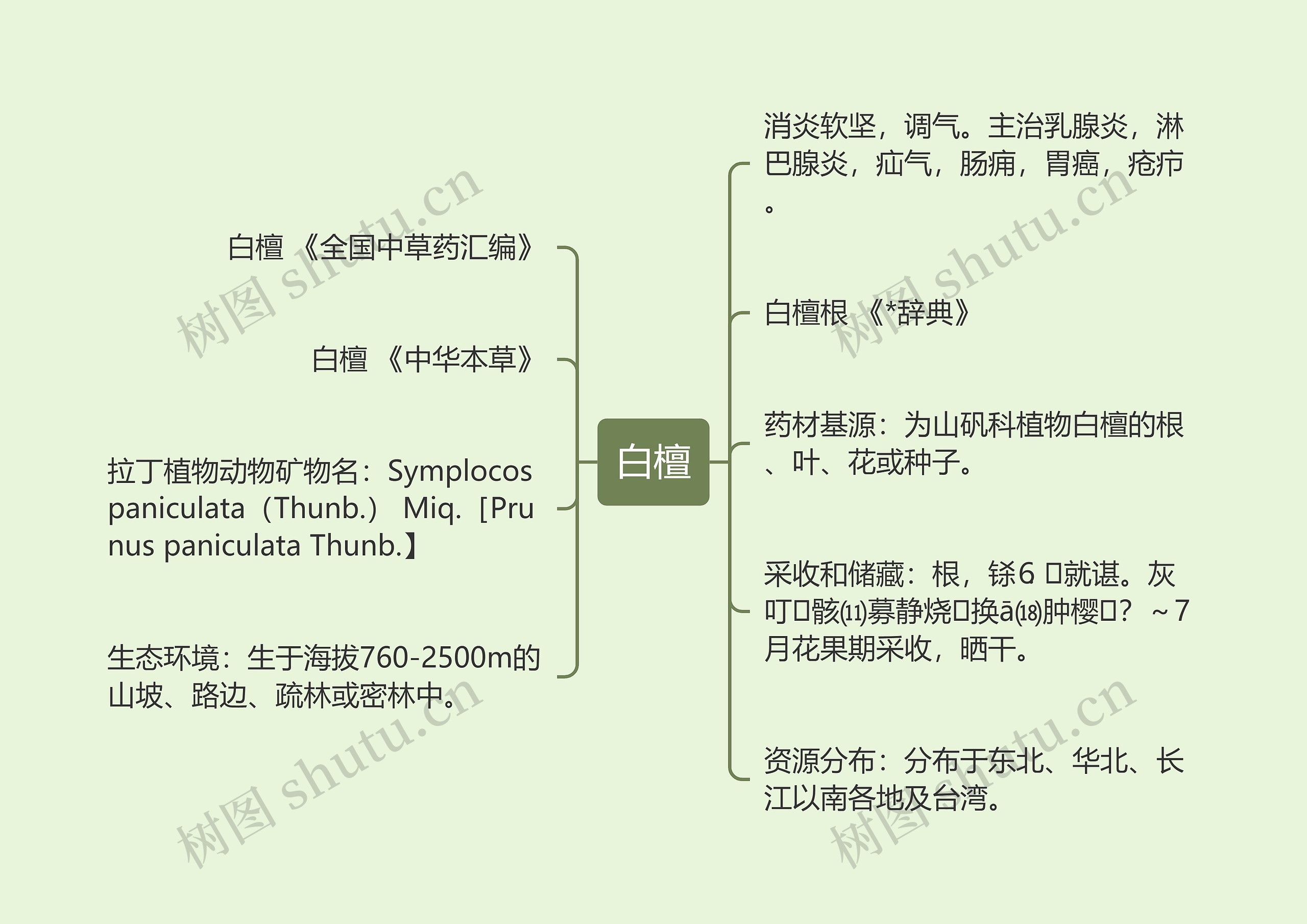 树图思维导图提供《白檀》在线思维导图免费制作,点击“编辑”按钮,可对《白檀》进行在线思维导图编辑,本思维导图属于思维导图模板主题,文件编号是:044097c75b5633982edbc8bf8d9cc94b