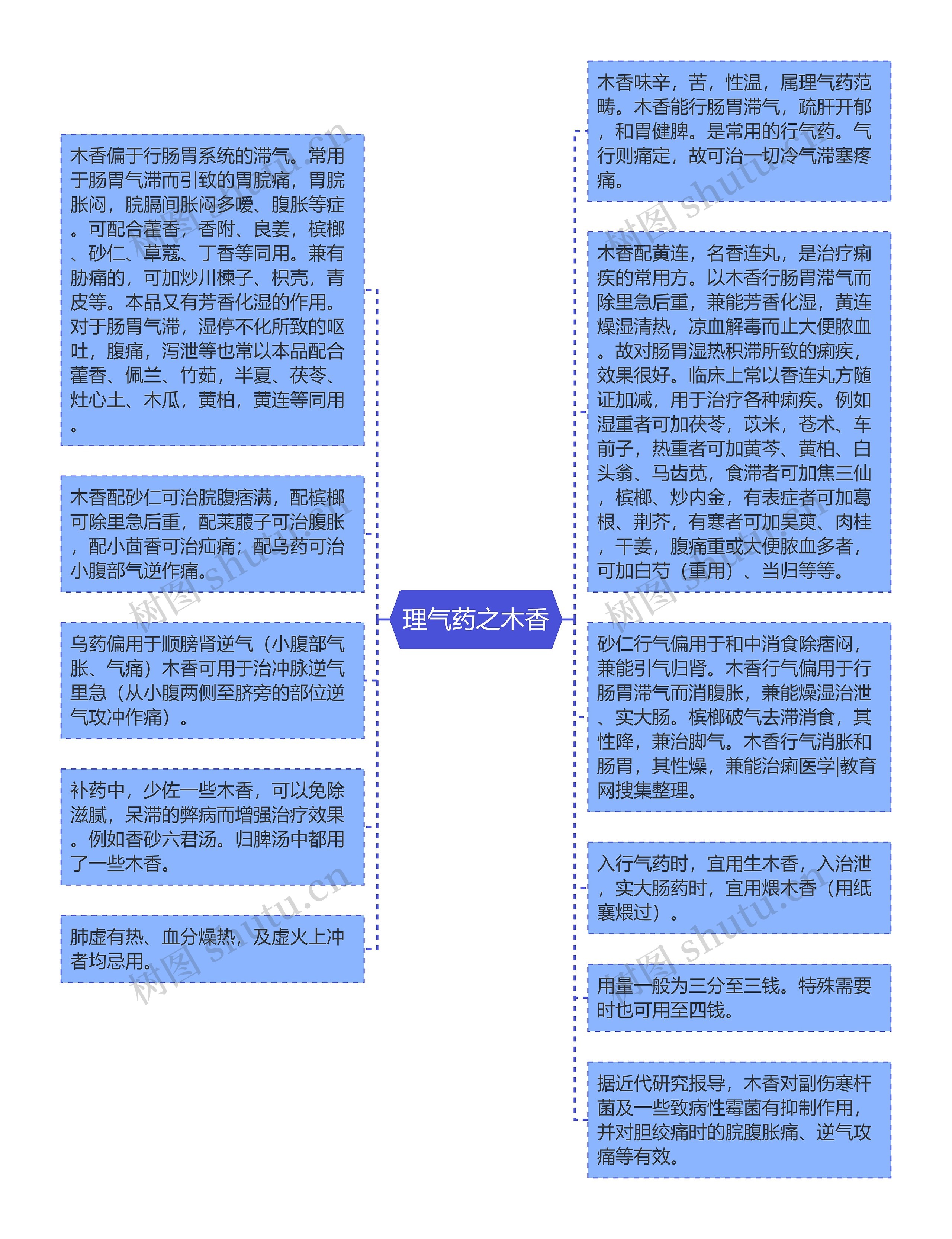 木香偏于行肠胃系统的滞气。常用于肠胃气滞而引致的胃脘痛,胃脘胀闷,脘膈间胀闷多嗳、腹胀等症。可配合藿香,香附、良姜,槟榔、砂仁、草蔻、丁香等同用。兼有胁痛的,可加炒川楝子、枳壳,青皮等。本品又有芳香化湿的作用。对于肠胃气滞,湿停不化所致的呕吐,腹痛,泻泄等也常以本品配合藿香、佩兰、竹茹,半夏、茯苓、灶心土、木瓜,黄柏,黄连等同用。