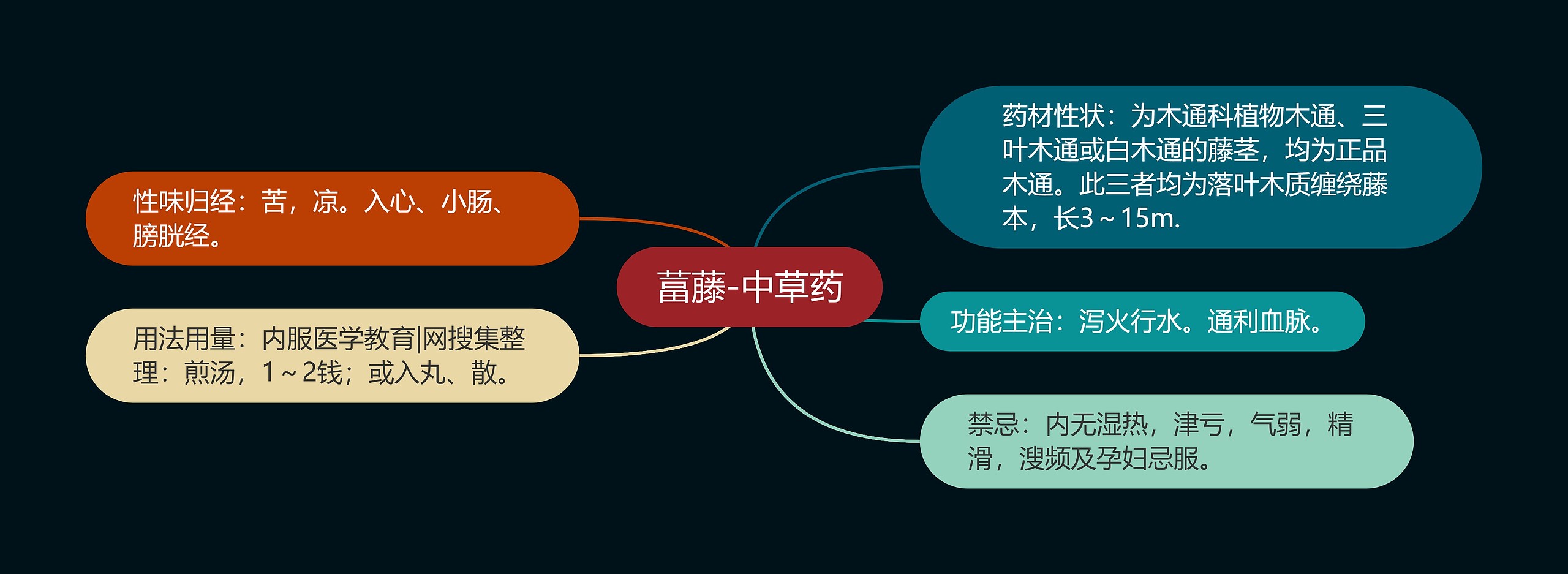 药材性状:为木通科植物木通、三叶木通或白木通的藤茎,均为正品木通。此三者均为落叶木质缠绕藤本,长3~15m. 性味归经:苦,凉。入心、小肠、膀胱经。 功能主治:泻火行水。通利血脉。 用法用量:内服医学教育|网搜集整理:煎汤,1~2钱;或入丸、散。 禁忌:内无湿热,津亏,气弱,精滑,溲频及孕妇忌服。