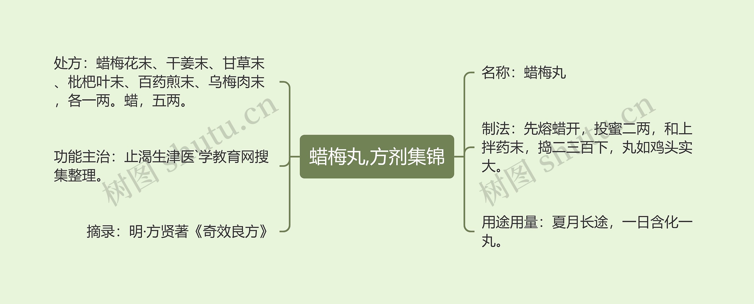 树图思维导图提供《蜡梅丸,方剂集锦》在线思维导图免费制作,点击“编辑”按钮,可对《蜡梅丸,方剂集锦》进行在线思维导图编辑,本思维导图属于思维导图模板主题,文件编号是:223ef271ac9078ba5d174197b696415d