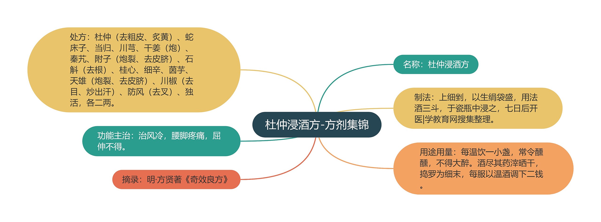 树图思维导图提供《杜仲浸酒方-方剂集锦》在线思维导图免费制作,点击“编辑”按钮,可对《杜仲浸酒方-方剂集锦》进行在线思维导图编辑,本思维导图属于思维导图模板主题,文件编号是:bc608a1cd62337031532ff411069538d
