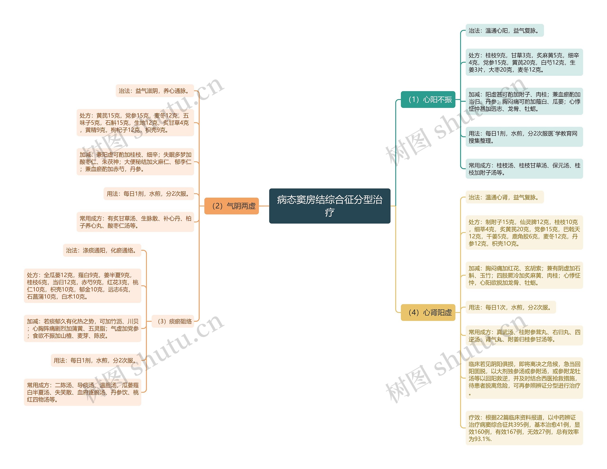 (1)心阳不振 治法:温通心阳,益气复脉。 处方:桂枝9克,甘草3克,炙麻黄5克,细辛4克,党参15克,黄芪20克,白芍12克,生姜3片,大枣20克,麦冬12克。 加减:阳虚甚可酌加附子、肉桂;兼血瘀酌加当归、丹参;胸闷痛可酌加薤白、瓜蒌;心悸怔忡甚加远志、龙骨、牡蛎。