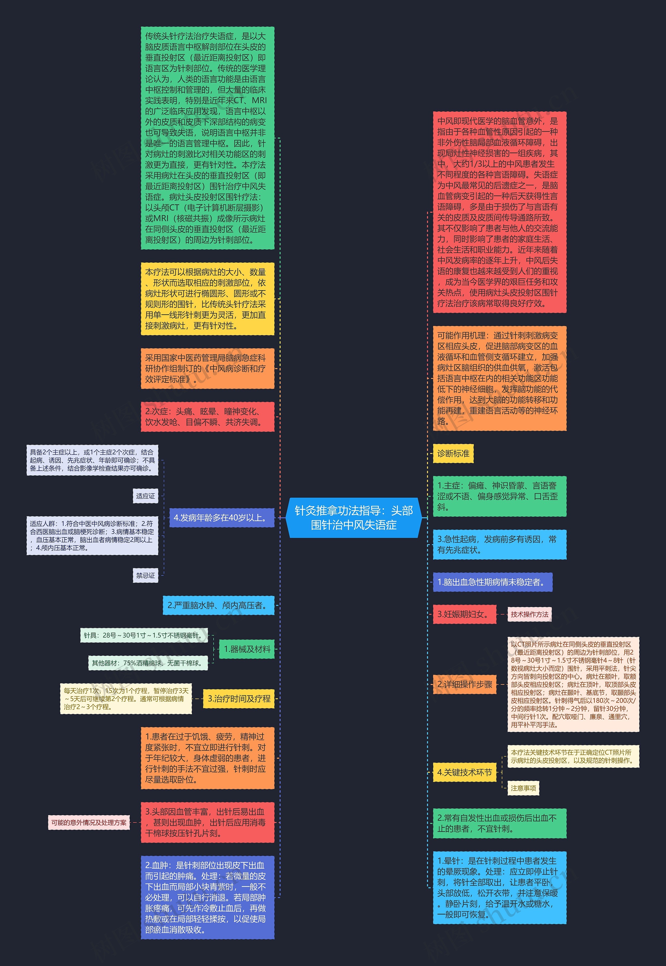 可能作用机理:通过针刺刺激病变区相应头皮,促进脑部病变区的血液循环和血管侧支循环建立,加强病灶区脑组织的供血供氧,激活包括语言中枢在内的相关功能区功能低下的神经细胞,发挥脑功能的代偿作用,达到大脑的功能转移和功能再建,重建语言活动等的神经环路。