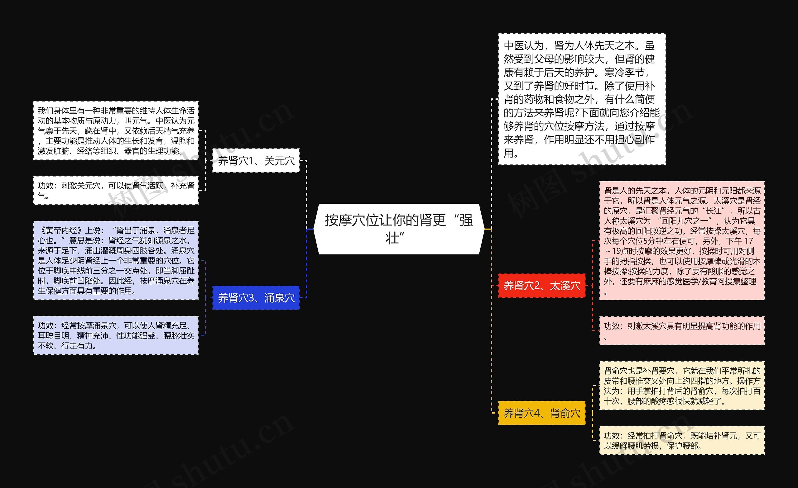树图思维导图提供《按摩穴位让你的肾更“强壮”》在线思维导图免费制作,点击“编辑”按钮,可对《按摩穴位让你的肾更“强壮”》进行在线思维导图编辑,本思维导图属于思维导图模板主题,文件编号是:1a133963d4cf59c6b6e5decb9890453f