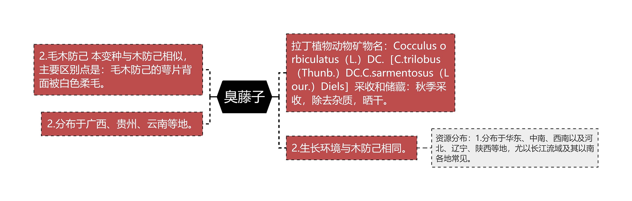 【拼音名】Chòu Ténɡ Zǐ 【来源】药材基源:为防己科植物毛木防己Cocculus orbiculatus(L.)DC.var.mollis(Wall.exHook.F.etThoms)Hara的茎。 拉丁植物动物矿物名:Cocculus orbiculatus(L.)DC.[C.trilobus(Thunb.)DC.C.sarmentosus(Lour.)Diels]采收和储藏:秋季采收,除去杂质,晒干。