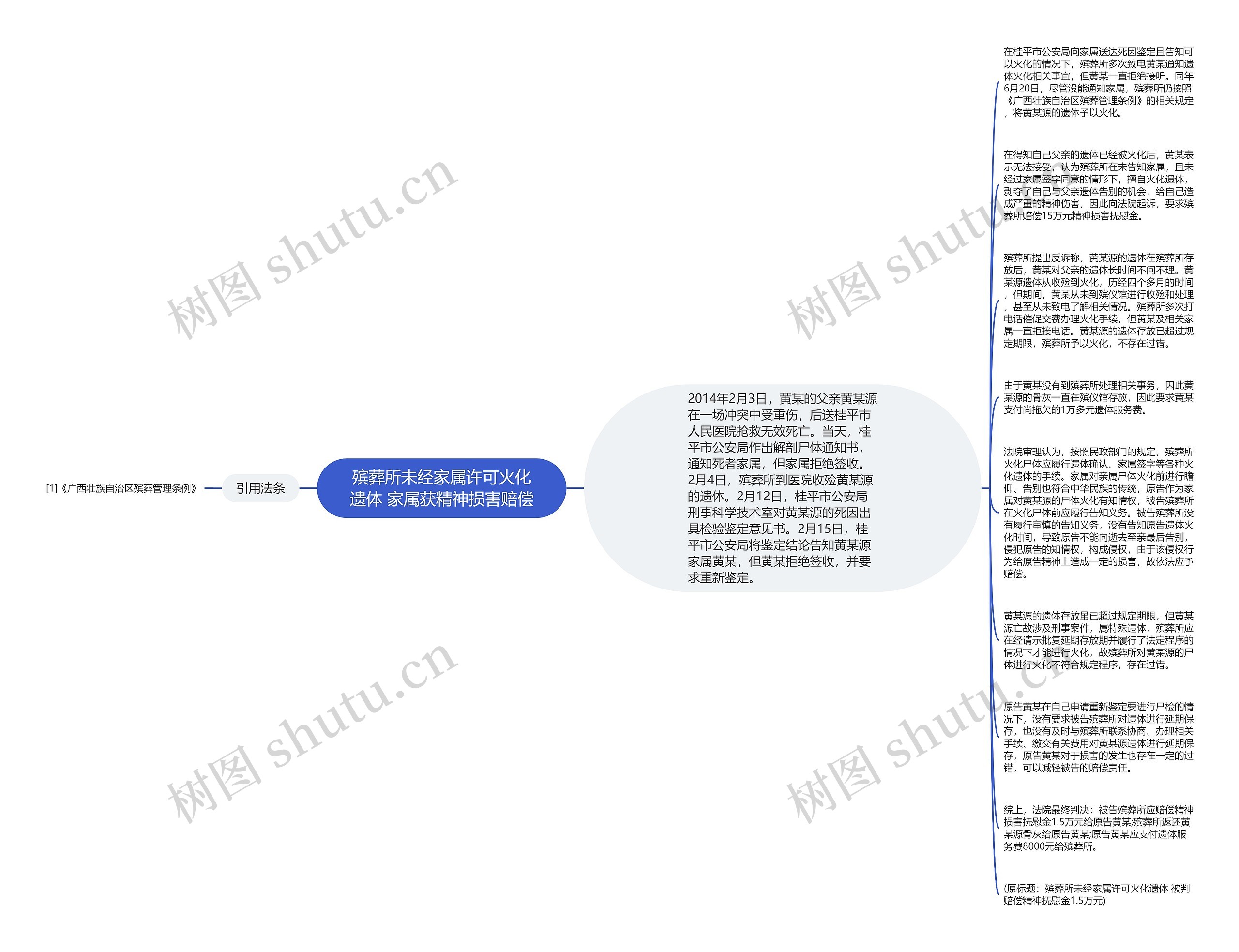 在得知自己父亲的遗体已经被火化后,黄某表示无法接受,认为殡葬所在未告知家属,且未经过家属签字同意的情形下,擅自火化遗体,剥夺了自己与父亲遗体告别的机会,给自己造成严重的精神伤害,因此向法院起诉,要求殡葬所赔偿15万元精神损害抚慰金。