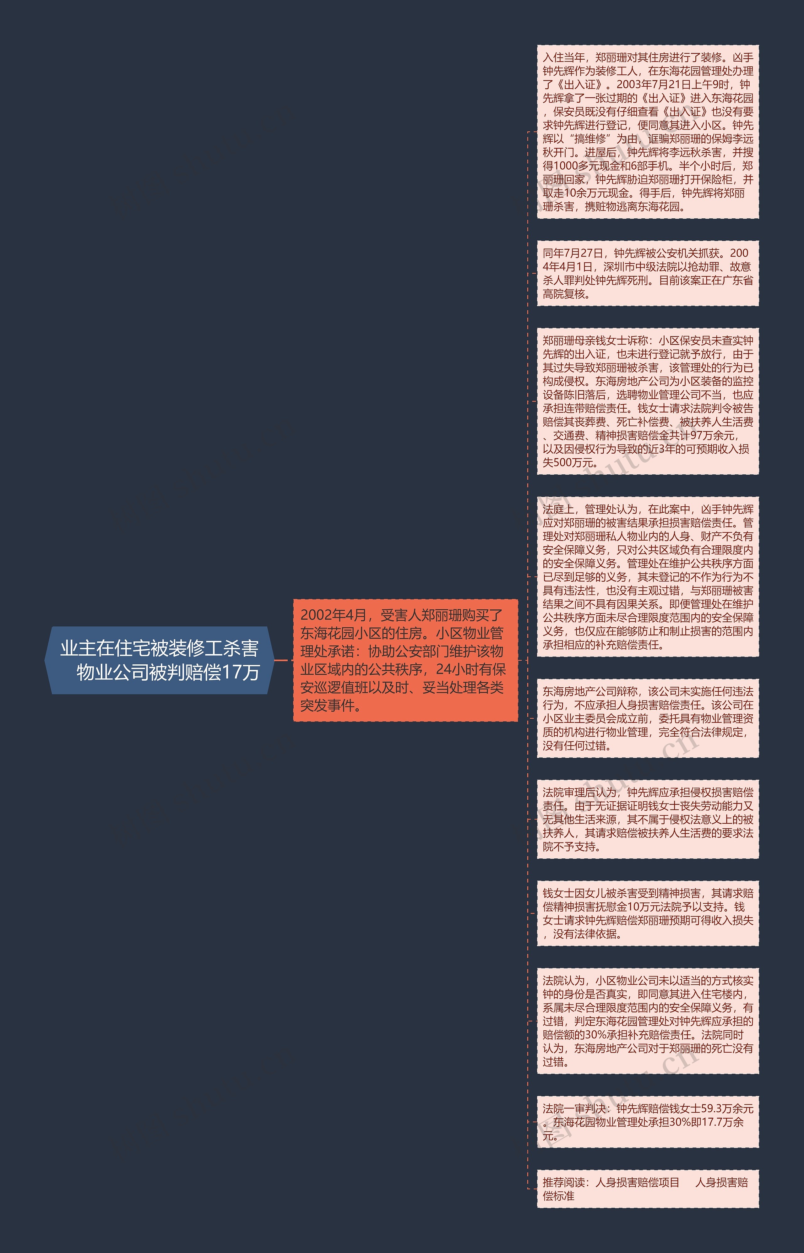 入住当年,郑丽珊对其住房进行了装修。凶手钟先辉作为装修工人,在东海花园管理处办理了《出入证》。2003年7月21日上午9时,钟先辉拿了一张过期的《出入证》进入东海花园,保安员既没有仔细查看《出入证》也没有要求钟先辉进行登记,便同意其进入小区。钟先辉以“搞维修”为由,诓骗郑丽珊的保姆李远秋开门。进屋后,钟先辉将李远秋杀害,并搜得1000多元现金和6部手机。半个小时后,郑丽珊回家,钟先辉胁迫郑丽珊打开保险柜,并取走10余万元现金。得手后,钟先辉将郑丽珊杀害,携赃物逃离东海花园。