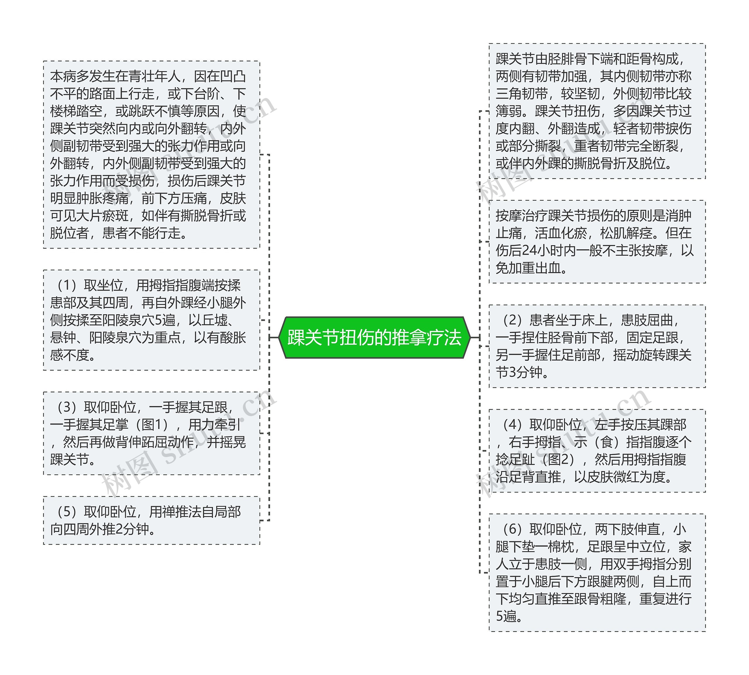 按摩治疗踝关节损伤的原则是消肿止痛,活血化瘀,松肌解痉。但在伤后24小时内一般不主张按摩,以免加重出血。