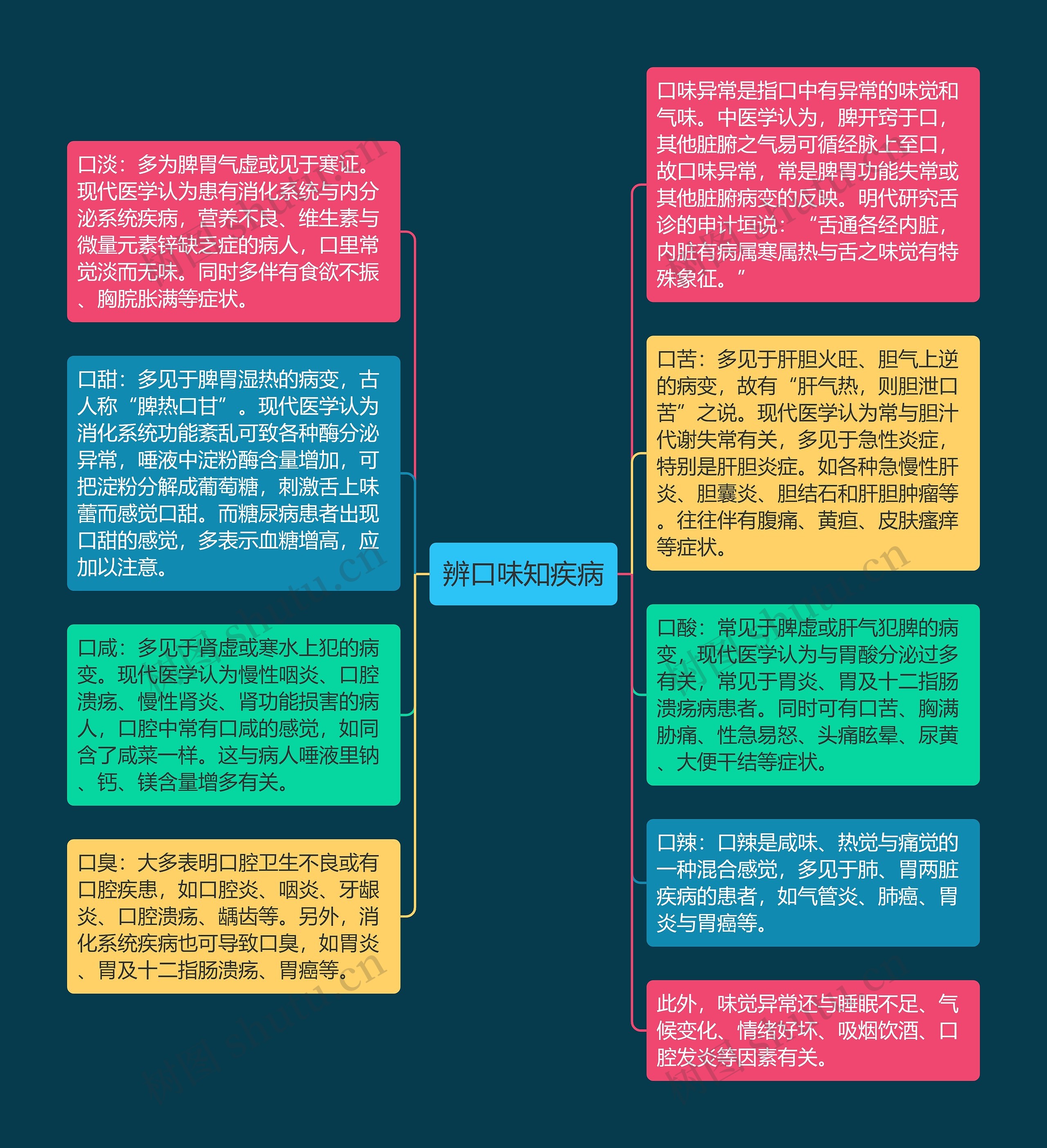 口味异常是指口中有异常的味觉和气味。中医学认为,脾开窍于口,其他脏腑之气易可循经脉上至口,故口味异常,常是脾胃功能失常或其他脏腑病变的反映。明代研究舌诊的申计垣说:“舌通各经内脏,内脏有病属寒属热与舌之味觉有特殊象征。”