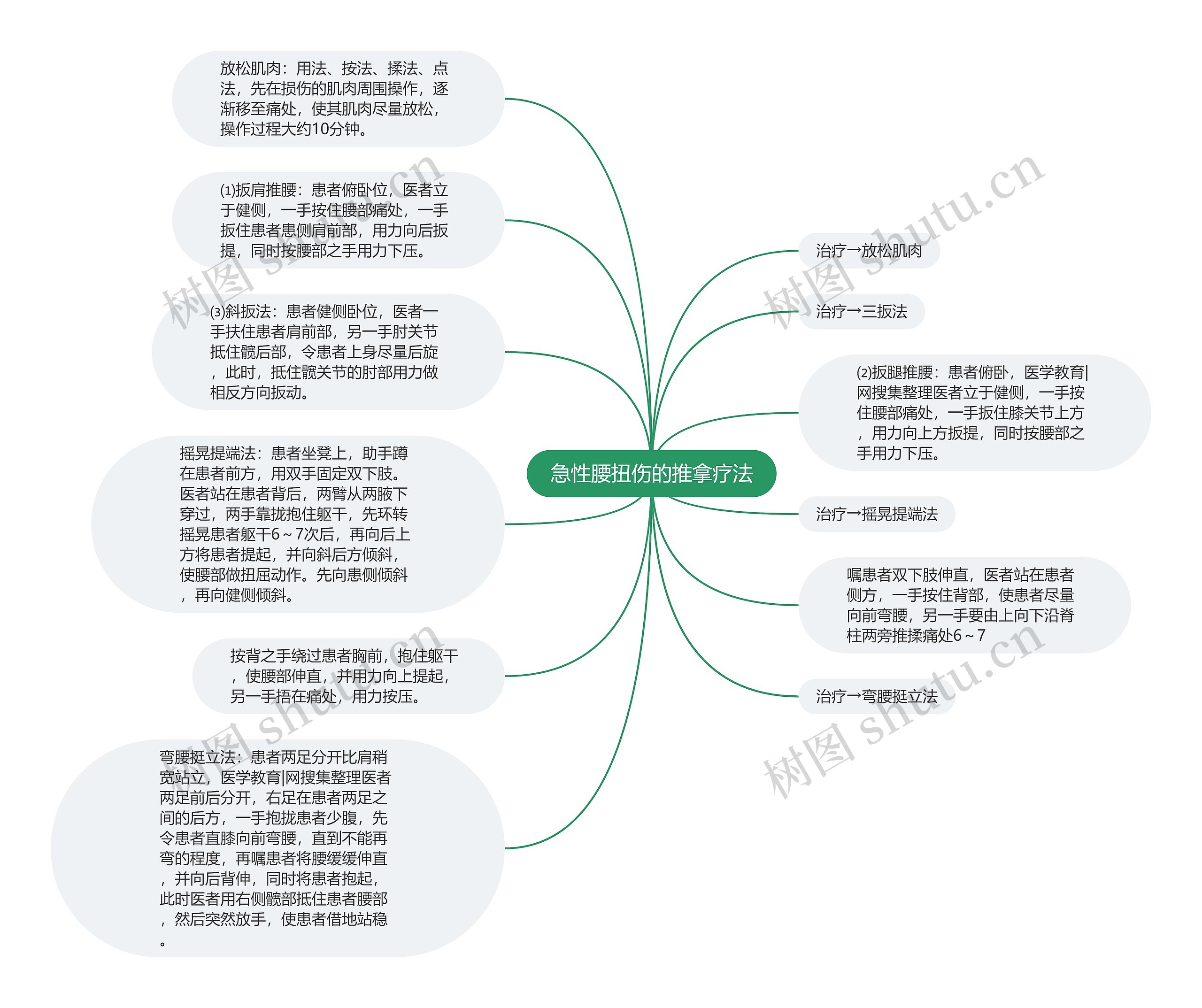 ⑴扳肩推腰:患者俯卧位,医者立于健侧,一手按住腰部痛处,一手扳住患者患侧肩前部,用力向后扳提,同时按腰部之手用力下压。