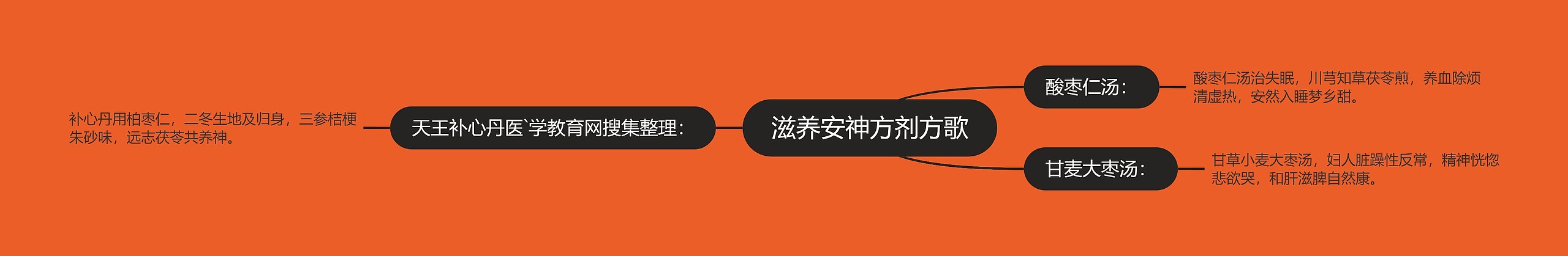 酸枣仁汤: 酸枣仁汤治失眠,川芎知草茯苓煎,养血除烦清虚热,安然入睡梦乡甜。 天王补心丹医`学教育网搜集整理: 补心丹用柏枣仁,二冬生地及归身,三参桔梗朱砂味,远志茯苓共养神。 甘麦大枣汤: 甘草小麦大枣汤,妇人脏躁性反常,精神恍惚悲欲哭,和肝滋脾自然康。