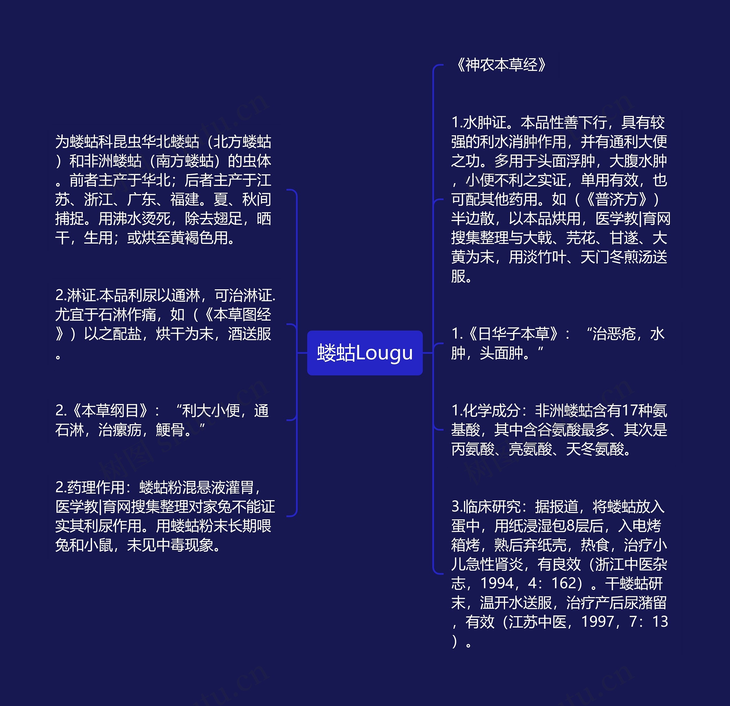 《神农本草经》 为蝼蛄科昆虫华北蝼蛄(北方蝼蛄)和非洲蝼蛄(南方蝼蛄)的虫体。前者主产于华北;后者主产于江苏、浙江、广东、福建。夏、秋间捕捉。用沸水烫死,除去翅足,晒干,生用;或烘至黄褐色用。 【性能】咸,寒。归膀胱、大肠、小肠经。 【功效】利水消肿,通淋。 【应用】 1.水肿证。