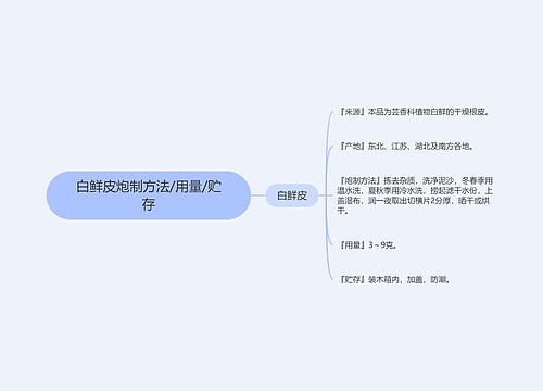 为芸香科植物白鲜的干燥根皮。主产于辽宁、河北、四川、江苏等地。春、秋二季采挖根部,除去泥沙及粗皮,剥取根皮,切片,干燥。生用。