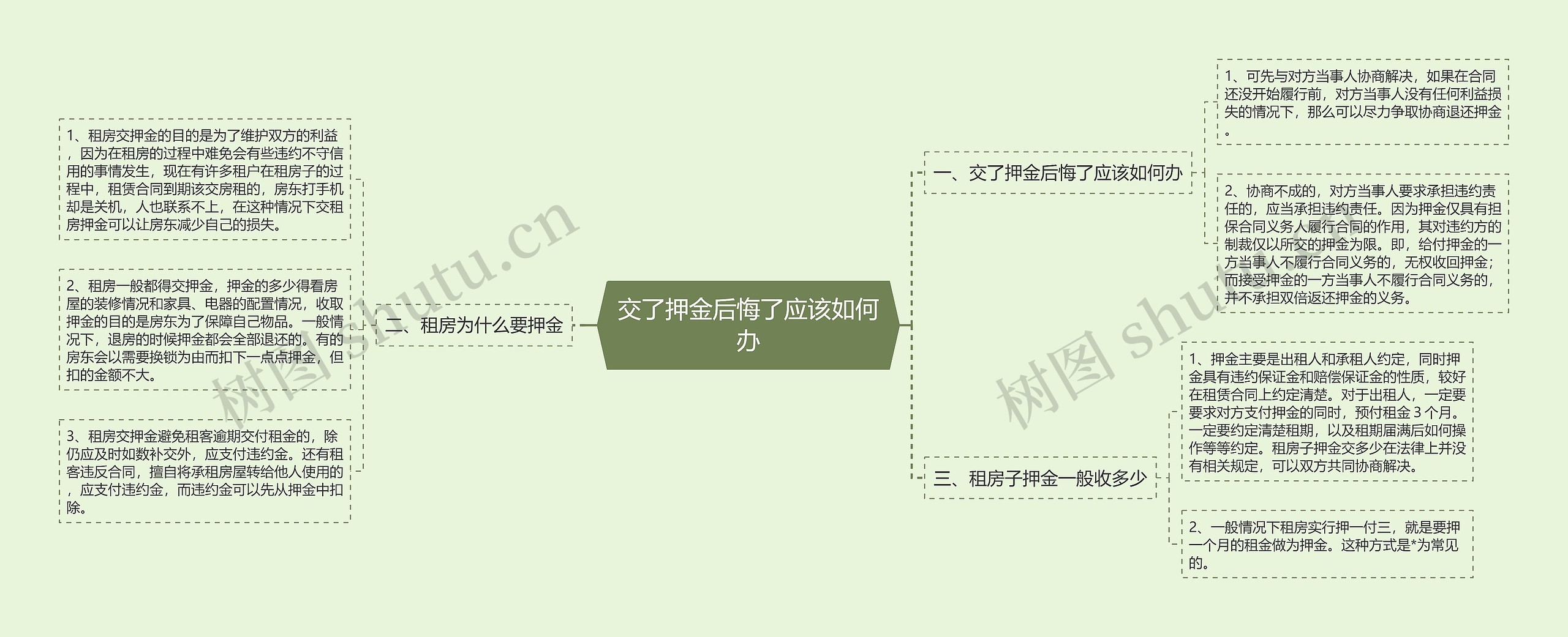 树图思维导图提供《交了押金后悔了应该如何办》在线思维导图免费制作,点击“编辑”按钮,可对《交了押金后悔了应该如何办》进行在线思维导图编辑,本思维导图属于思维导图模板主题,文件编号是:3dd68e0817b6095ec26ba5a04631c57a