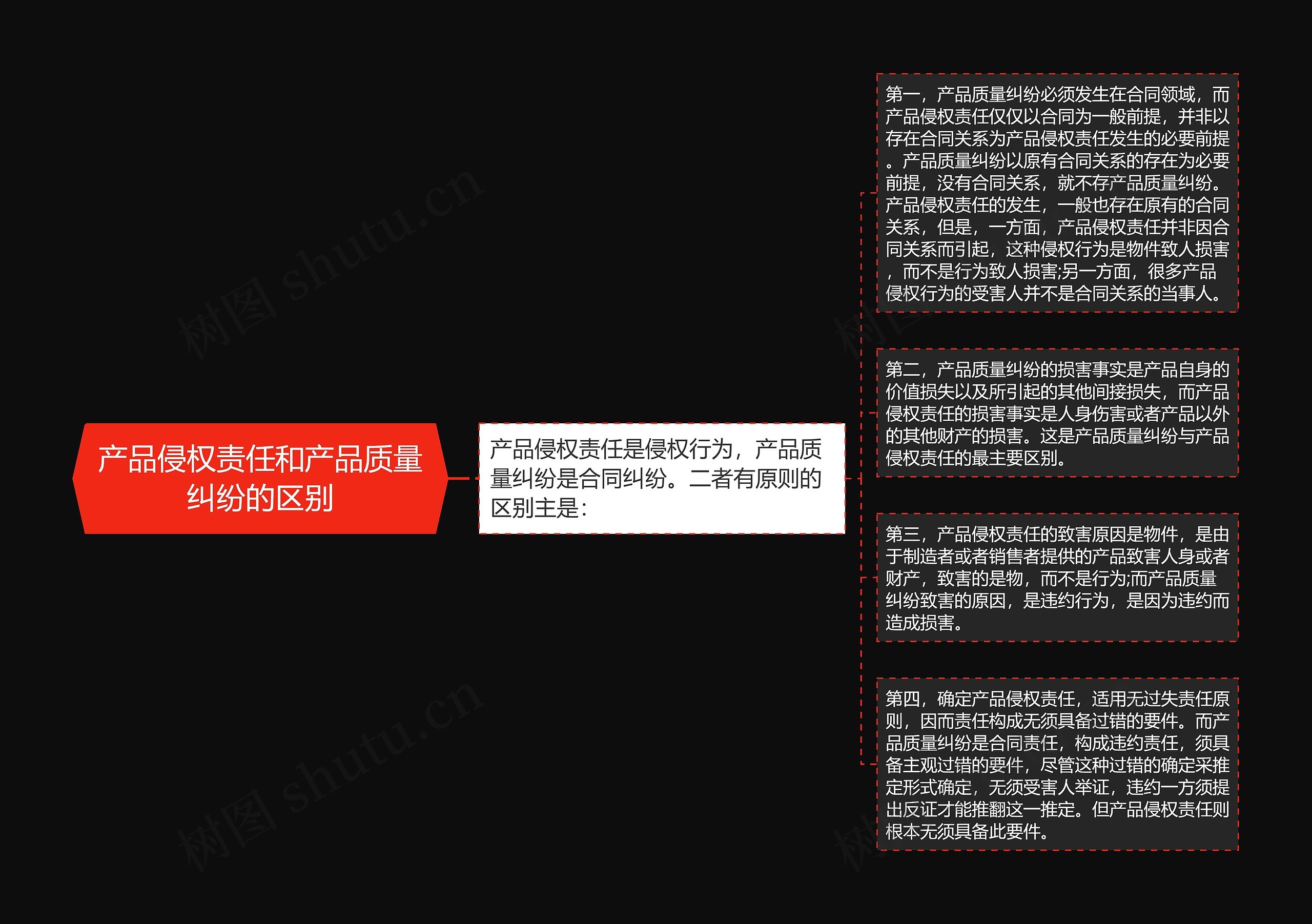 第一,产品质量纠纷必须发生在合同领域,而产品侵权责任仅仅以合同为一般前提,并非以存在合同关系为产品侵权责任发生的必要前提。产品质量纠纷以原有合同关系的存在为必要前提,没有合同关系,就不存产品质量纠纷。产品侵权责任的发生,一般也存在原有的合同关系,但是,一方面,产品侵权责任并非因合同关系而引起,这种侵权行为是物件致人损害,而不是行为致人损害;另一方面,很多产品侵权行为的受害人并不是合同关系的当事人。