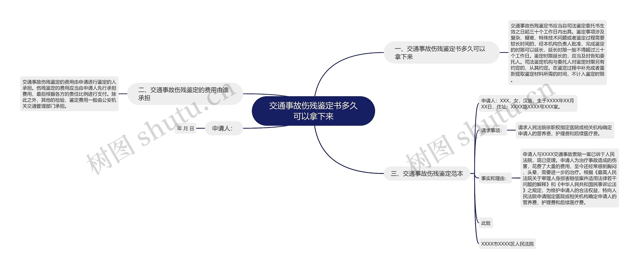 树图思维导图提供《交通事故伤残鉴定书多久可以拿下来》在线思维导图免费制作,点击“编辑”按钮,可对《交通事故伤残鉴定书多久可以拿下来》进行在线思维导图编辑,本思维导图属于思维导图模板主题,文件编号是:8f0a074ec4ee43c15c2414ec96ea36b2