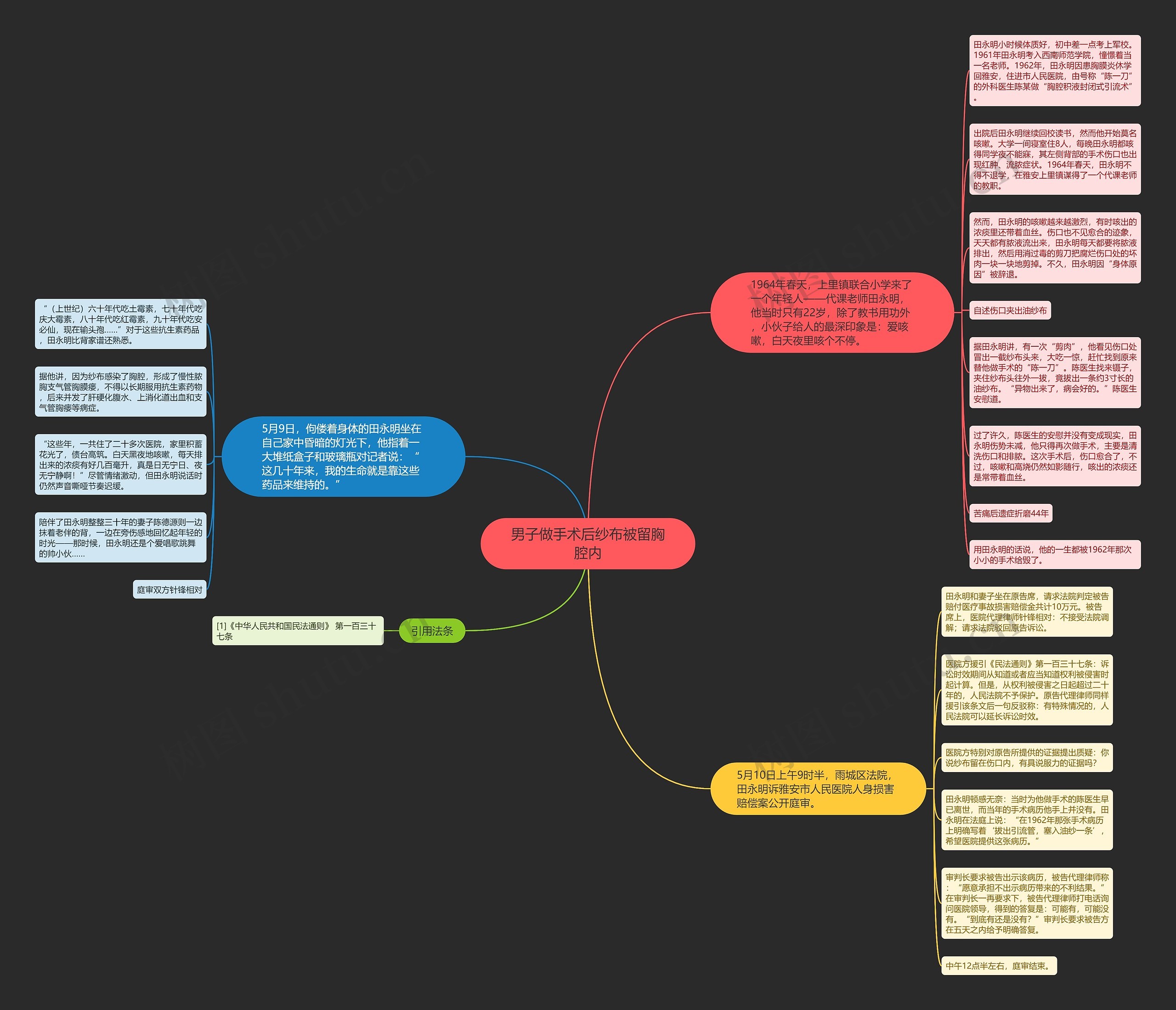 树图思维导图提供《男子做手术后纱布被留胸腔内》在线思维导图免费制作,点击“编辑”按钮,可对《男子做手术后纱布被留胸腔内》进行在线思维导图编辑,本思维导图属于思维导图模板主题,文件编号是:eb72b0af89cc25bf217e6385aae49827