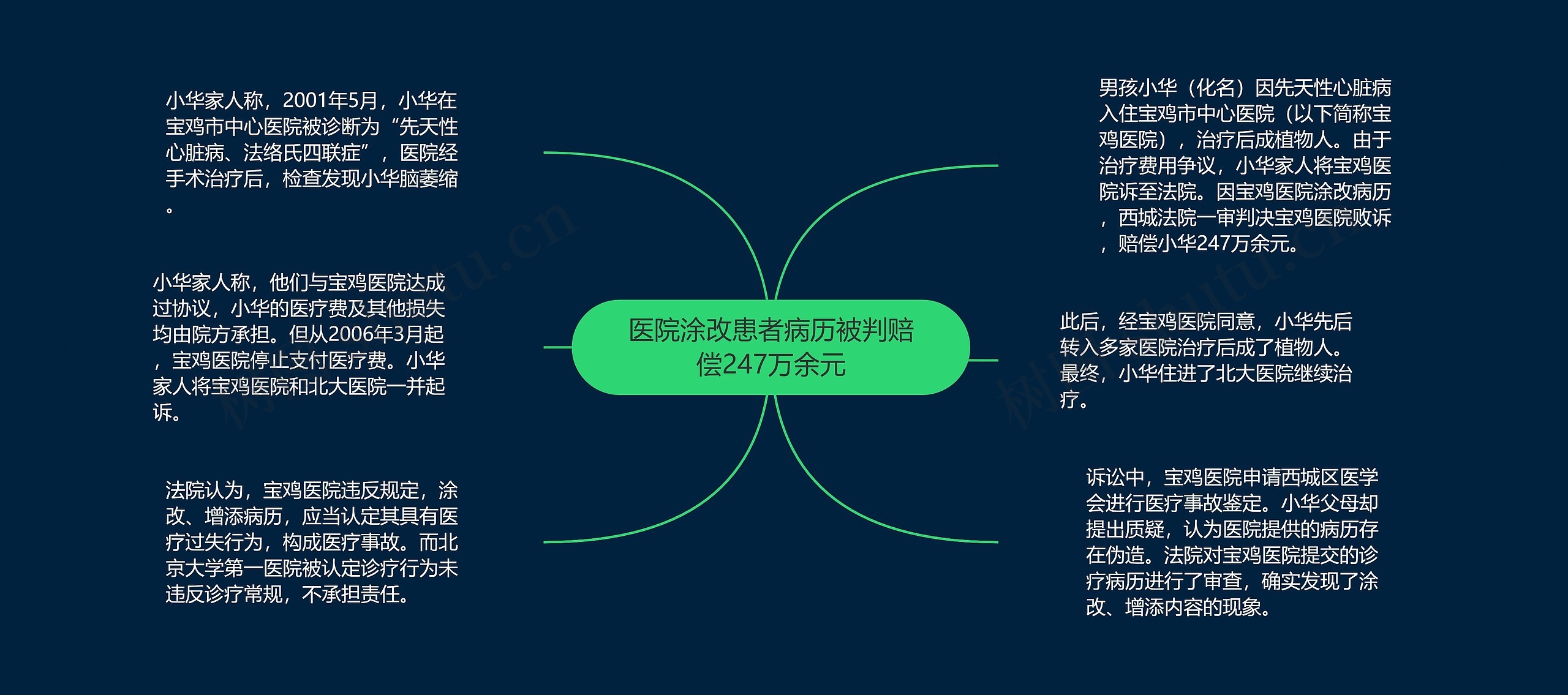 男孩小华(化名)因先天性心脏病入住宝鸡市中心医院(以下简称宝鸡医院),治疗后成植物人。由于治疗费用争议,小华家人将宝鸡医院诉至法院。因宝鸡医院涂改病历,西城法院一审判决宝鸡医院败诉,赔偿小华247万余元。