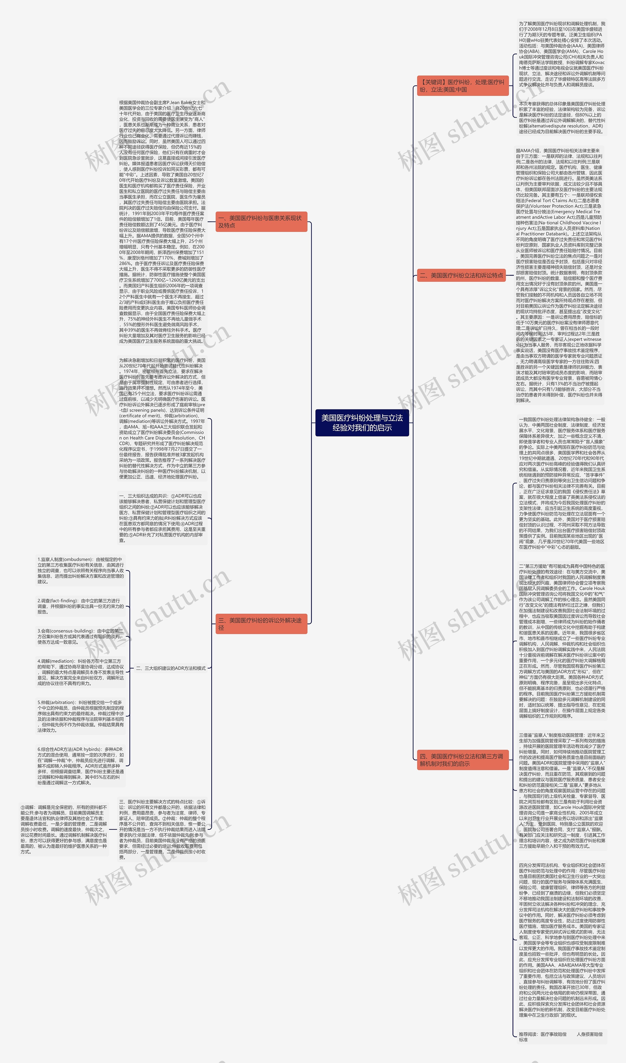 一我国医疗纠纷处理法律架构急待健全:一般认为,中美两国社会制度、法律制度、经济发展水平、文化背景、医疗服务体系和医疗服务保障体系差异很大,加之一些概念定义不清,即使是学者和专业人员也常常陷于"盲人摸象"的争论。实际上中美两国在医疗纠纷防范与处理上的共同点很多,美国医学界和社会各界从19世纪中期就遭遇、20世纪70年代和90年代应对两次医疗纠纷高峰的经验值得我们认真研究和借鉴。从实际情况看,近年来我国卫生系统相继遇到的预防接种异常反应、"签字事件"、医疗过失归责原则等突出卫生信访问题和争论,都与医疗纠纷相关法律不完善有关。目前,正在广泛征求意见的我国《侵权责任法》草案,就在很大程度上借鉴了英美法系侵权法的立法模式,并将成为今后我国处理医疗纠纷的支架性法律,应当引起卫生系统的高度重视,力争使医疗纠纷防范与处理在立法层面有一个更为坚实的基础。此外,美国对于医疗损害赔偿封顶的认识过程、不同州采取不同方法导致的不同结果,为我们出台医疗损害赔偿封顶政策提供了实例。目前我国某些地区出现的"医闹"现象,几乎是20世纪70年代美国一些地区在医疗纠纷中"中彩"心态的翻版。