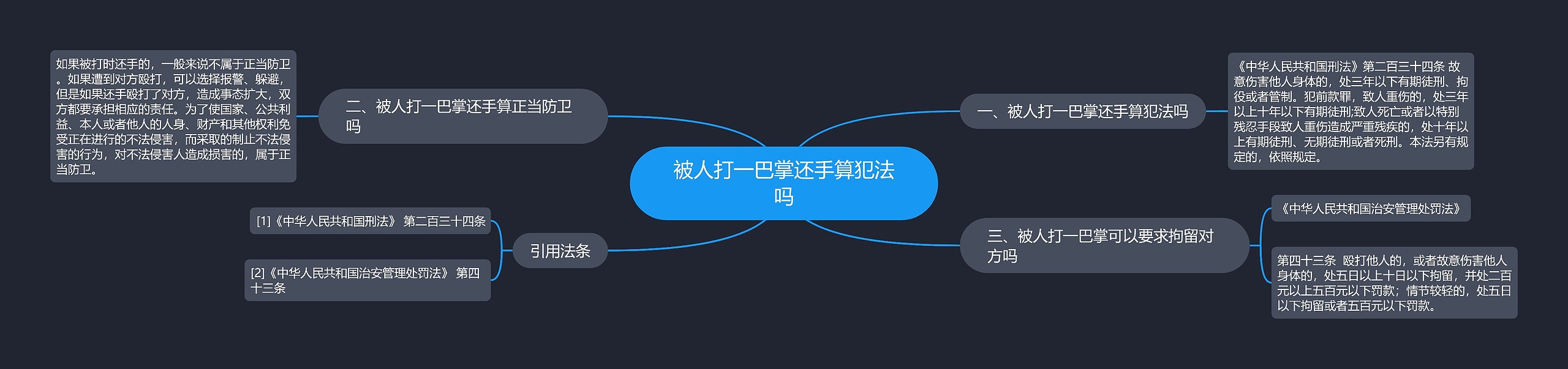 树图思维导图提供《被人打一巴掌还手算犯法吗》在线思维导图免费制作,点击“编辑”按钮,可对《被人打一巴掌还手算犯法吗》进行在线思维导图编辑,本思维导图属于思维导图模板主题,文件编号是:6b55ce9a448105795cac7b8cb53a1ec6