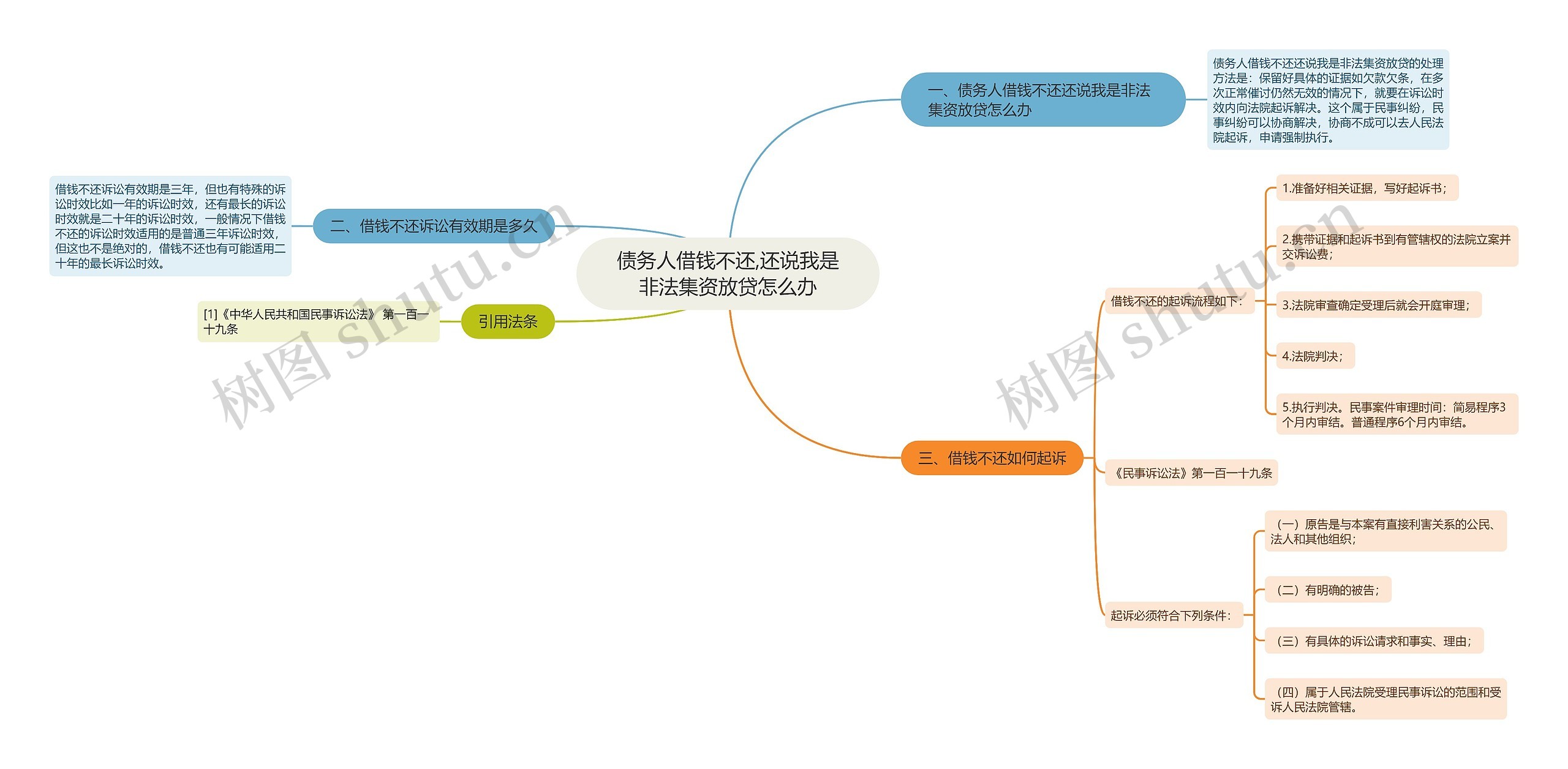 树图思维导图提供《债务人借钱不还,还说我是非法集资放贷怎么办》在线思维导图免费制作,点击“编辑”按钮,可对《债务人借钱不还,还说我是非法集资放贷怎么办》进行在线思维导图编辑,本思维导图属于思维导图模板主题,文件编号是:084b8efd6ba333d0ab34df74eac44a16