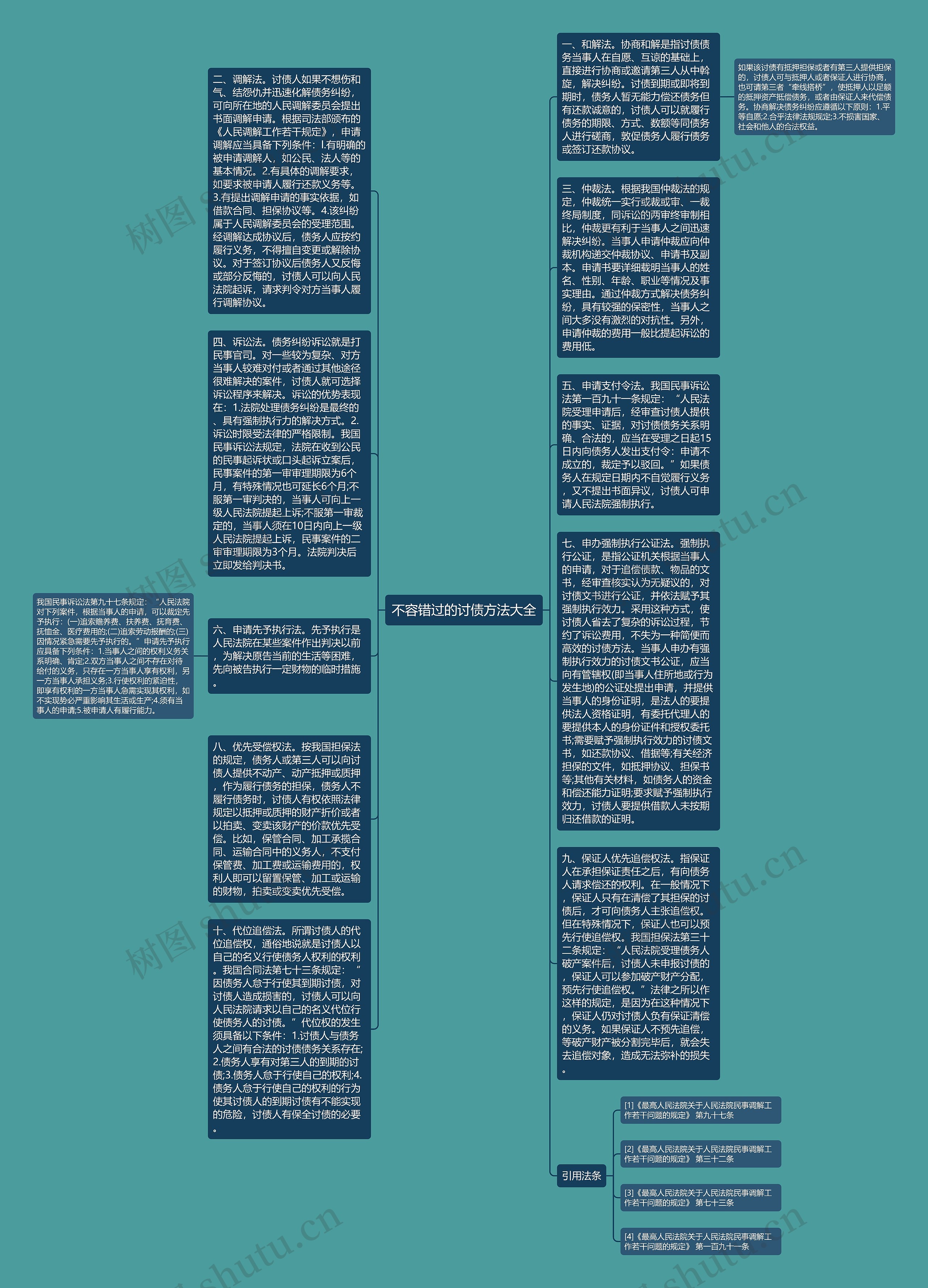 十、代位追偿法。所谓讨债人的代位追偿权,通俗地说就是讨债人以自己的名义行使债务人权利的权利。我国合同法第七十三条规定:“因债务人怠于行使其到期讨债,对讨债人造成损害的,讨债人可以向人民法院请求以自己的名义代位行使债务人的讨债。”代位权的发生须具备以下条件:1.讨债人与债务人之间有合法的讨债债务关系存在;2.债务人享有对第三人的到期的讨债;3.债务人怠于行使自己的权利;4.债务人怠于行使自己的权利的行为使其讨债人的到期讨债有不能实现的危险,讨债人有保全讨债的必要。
