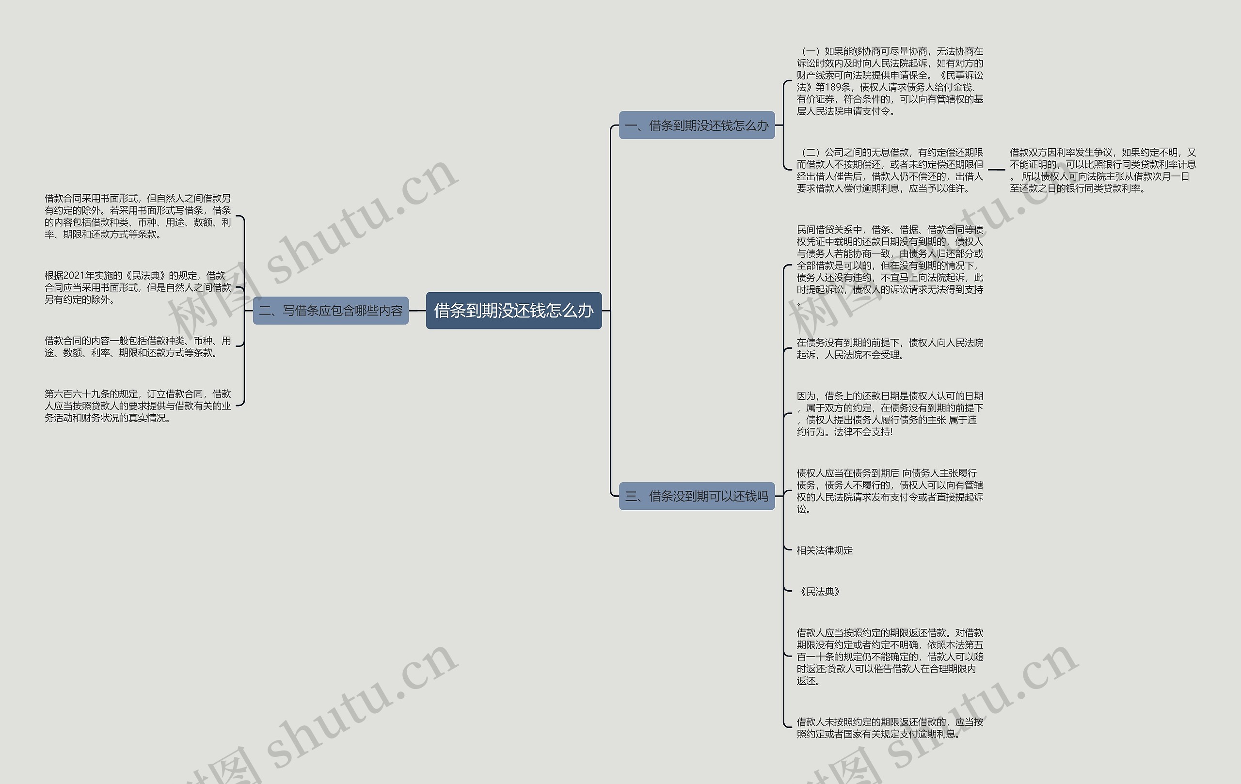 树图思维导图提供《借条到期没还钱怎么办》在线思维导图免费制作,点击“编辑”按钮,可对《借条到期没还钱怎么办》进行在线思维导图编辑,本思维导图属于思维导图模板主题,文件编号是:e3452eafe18824ad4298674abed70a90